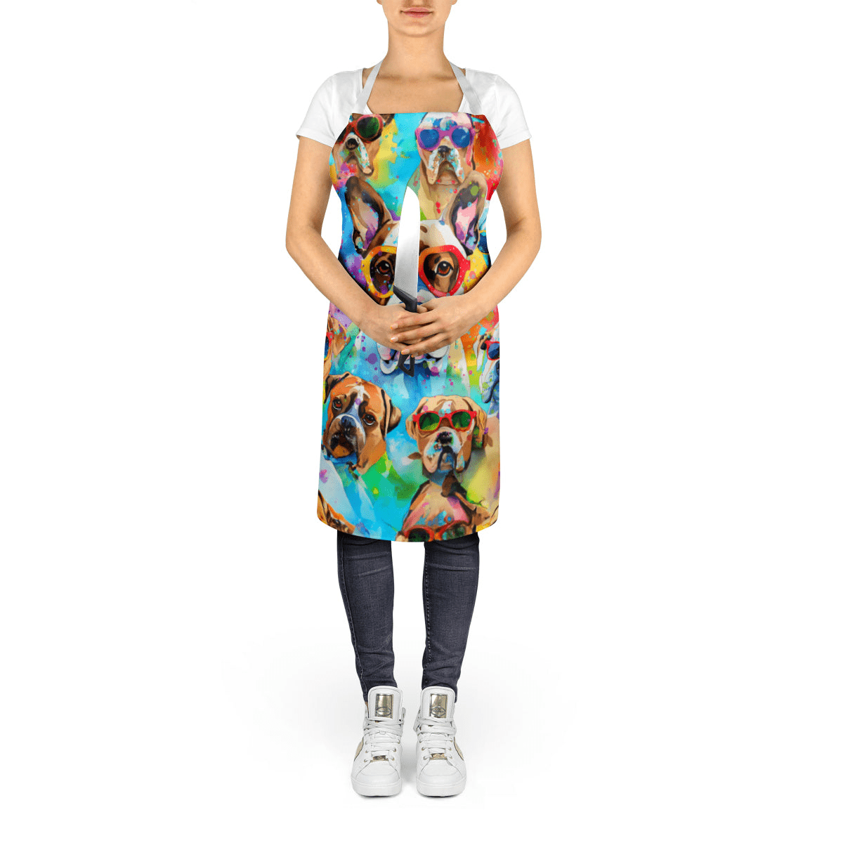 Apron featuring breed specific Boxer artwork. Elevate your cooking, baking, and grilling experiences with our versatile Kitchen or BBQ Apron. This Bib Style apron isn't just limited to culinary activities - it also serves as an excellent baking apron, artist apron, server apron, gardening apron, or even a dog grooming apron. The apron showcases vibrant full-color artwork contributed by one of our talented artists, bringing a dash of style to your daily tasks. With dimensions of approximately 27"W x 30"H, it provides ample coverage to protect your clothing from spills and splashes. Our apron is meticulously crafted from 100% Ultra Spun Polyester, known for its durability and lightweight nature. The apron comes with white tie straps, ensuring a comfortable and adjustable fit for all. It's a perfect choice for kitchen apron enthusiasts, whether you are a woman or a man. Designed for easy maintenance, this apron is fully machine washable. The quick-drying polyester material actively reduces staining, keeping your apron looking fresh and new for longer. Our beautifully designed apron isn't just a functional kitchen accessory - it's a fashion statement in the culinary world!