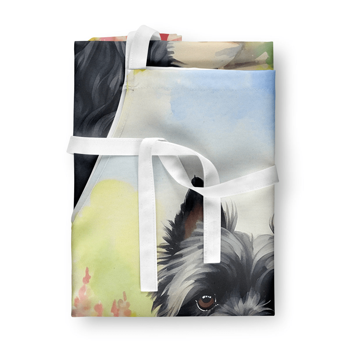 Apron featuring breed specific Cairn Terrier artwork. Elevate your cooking, baking, and grilling experiences with our versatile Kitchen or BBQ Apron. This Bib Style apron isn't just limited to culinary activities - it also serves as an excellent baking apron, artist apron, server apron, gardening apron, or even a dog grooming apron. The apron showcases vibrant full-color artwork contributed by one of our talented artists, bringing a dash of style to your daily tasks. With dimensions of approximately 27"W x 30"H, it provides ample coverage to protect your clothing from spills and splashes. Our apron is meticulously crafted from 100% Ultra Spun Polyester, known for its durability and lightweight nature. The apron comes with white tie straps, ensuring a comfortable and adjustable fit for all. It's a perfect choice for kitchen apron enthusiasts, whether you are a woman or a man. Designed for easy maintenance, this apron is fully machine washable. The quick-drying polyester material actively reduces staining, keeping your apron looking fresh and new for longer. Our beautifully designed apron isn't just a functional kitchen accessory - it's a fashion statement in the culinary world!