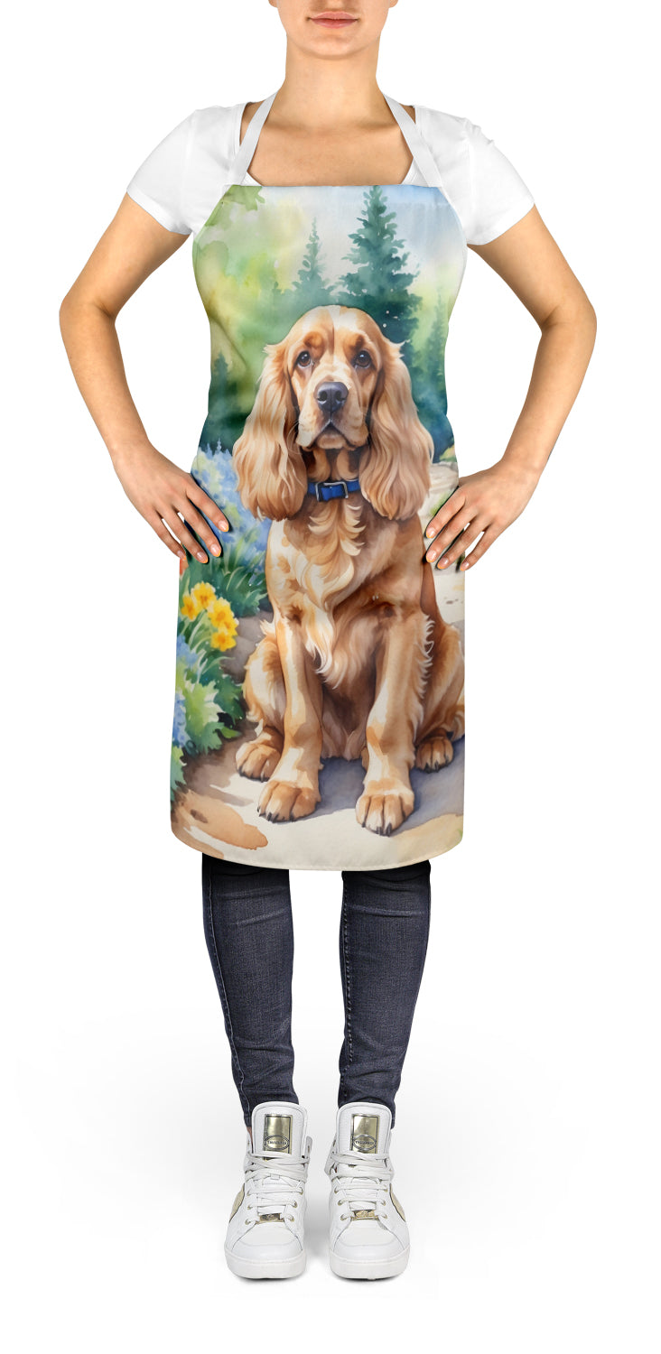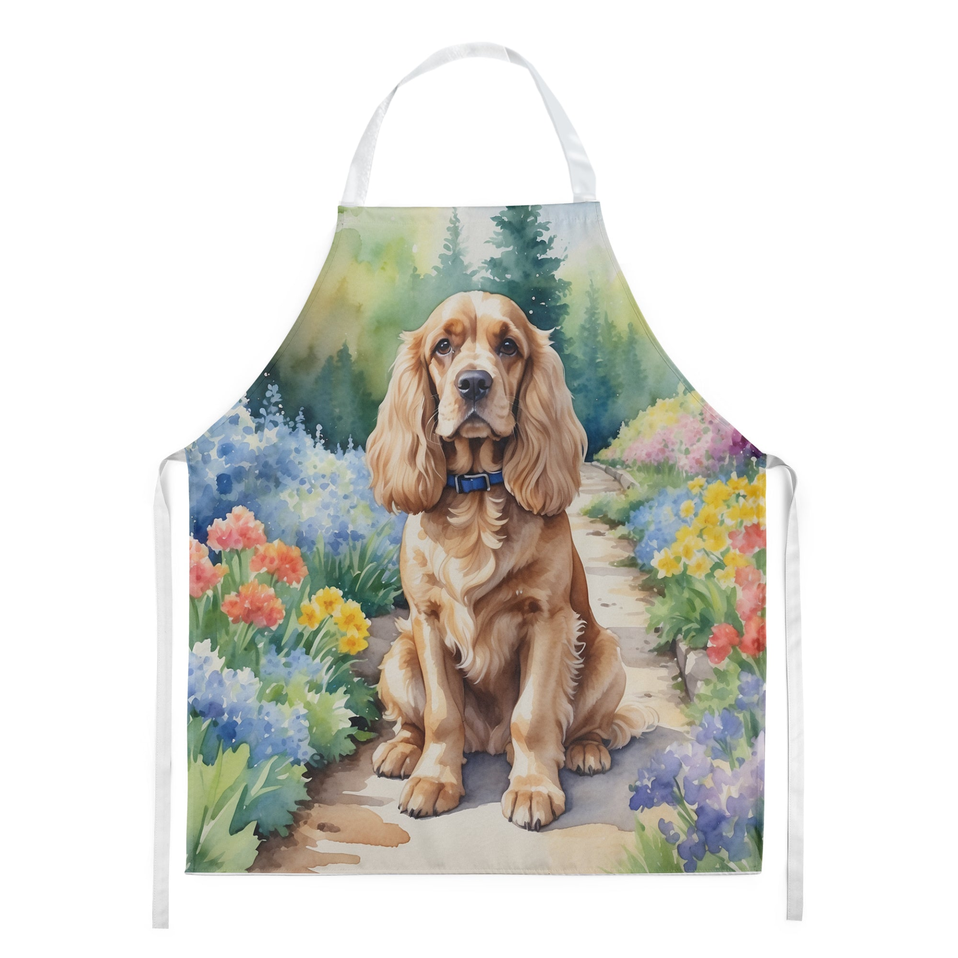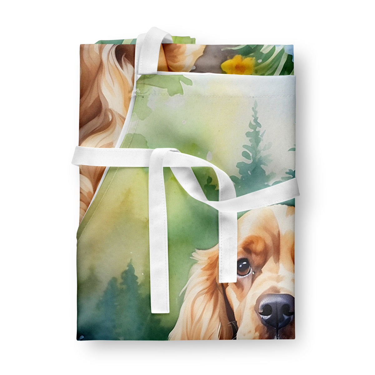 Apron featuring breed specific Cocker Spaniel artwork. Elevate your cooking, baking, and grilling experiences with our versatile Kitchen or BBQ Apron. This Bib Style apron isn't just limited to culinary activities - it also serves as an excellent baking apron, artist apron, server apron, gardening apron, or even a dog grooming apron. The apron showcases vibrant full-color artwork contributed by one of our talented artists, bringing a dash of style to your daily tasks. With dimensions of approximately 27"W x 30"H, it provides ample coverage to protect your clothing from spills and splashes. Our apron is meticulously crafted from 100% Ultra Spun Polyester, known for its durability and lightweight nature. The apron comes with white tie straps, ensuring a comfortable and adjustable fit for all. It's a perfect choice for kitchen apron enthusiasts, whether you are a woman or a man. Designed for easy maintenance, this apron is fully machine washable. The quick-drying polyester material actively reduces staining, keeping your apron looking fresh and new for longer. Our beautifully designed apron isn't just a functional kitchen accessory - it's a fashion statement in the culinary world!