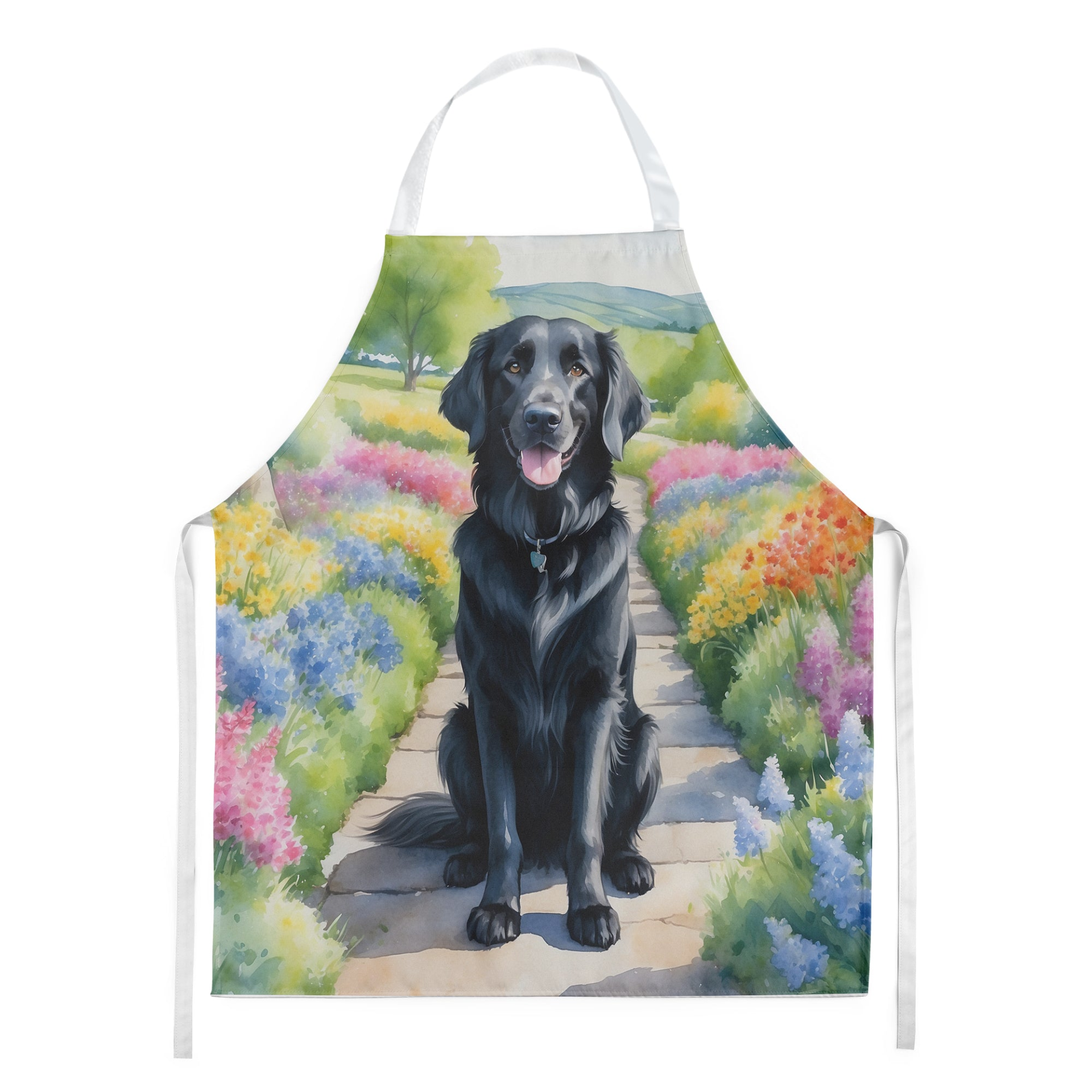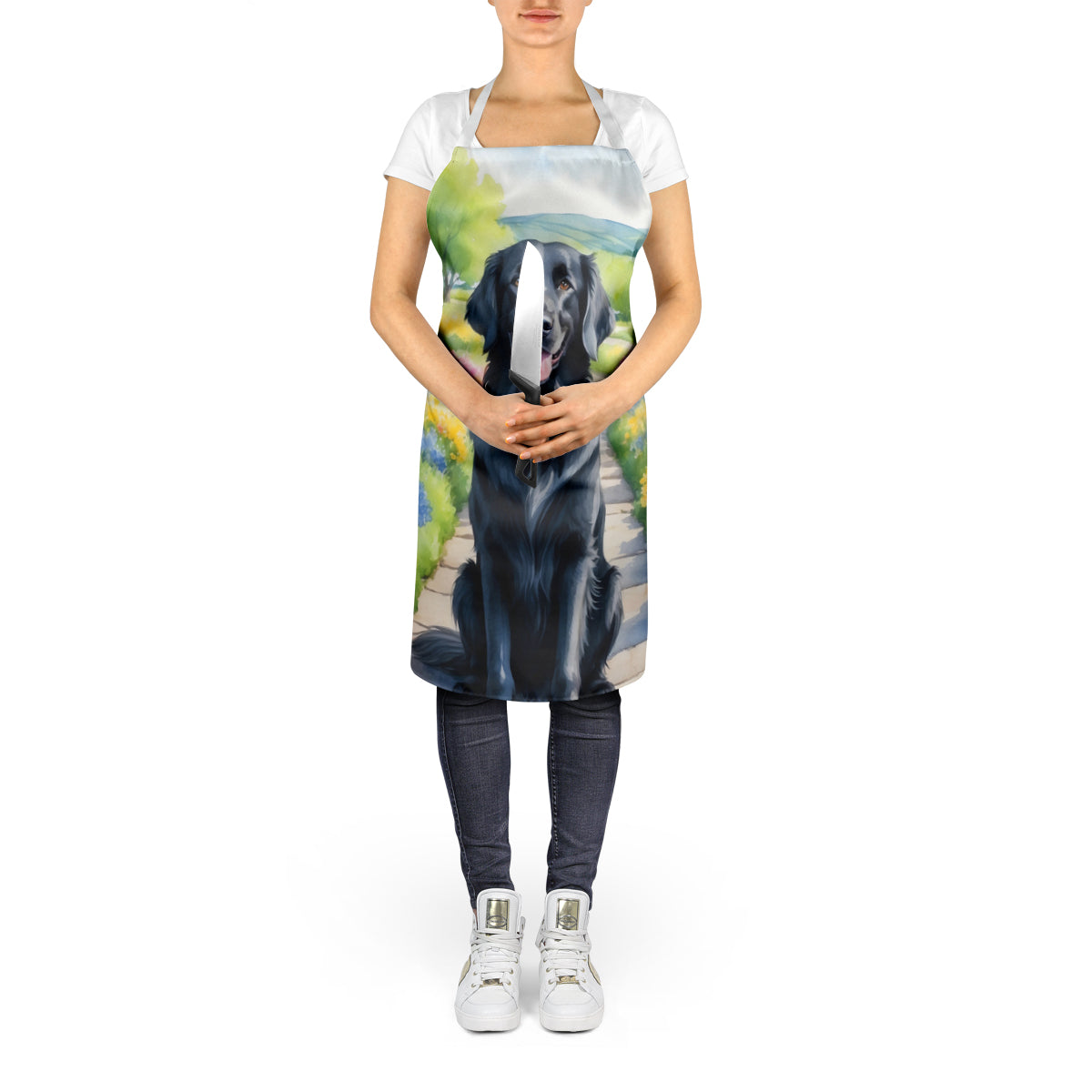 Apron featuring breed specific Flat-Coated Retriever artwork. Elevate your cooking, baking, and grilling experiences with our versatile Kitchen or BBQ Apron. This Bib Style apron isn't just limited to culinary activities - it also serves as an excellent baking apron, artist apron, server apron, gardening apron, or even a dog grooming apron. The apron showcases vibrant full-color artwork contributed by one of our talented artists, bringing a dash of style to your daily tasks. With dimensions of approximately 27"W x 30"H, it provides ample coverage to protect your clothing from spills and splashes. Our apron is meticulously crafted from 100% Ultra Spun Polyester, known for its durability and lightweight nature. The apron comes with white tie straps, ensuring a comfortable and adjustable fit for all. It's a perfect choice for kitchen apron enthusiasts, whether you are a woman or a man. Designed for easy maintenance, this apron is fully machine washable. The quick-drying polyester material actively reduces staining, keeping your apron looking fresh and new for longer. Our beautifully designed apron isn't just a functional kitchen accessory - it's a fashion statement in the culinary world!