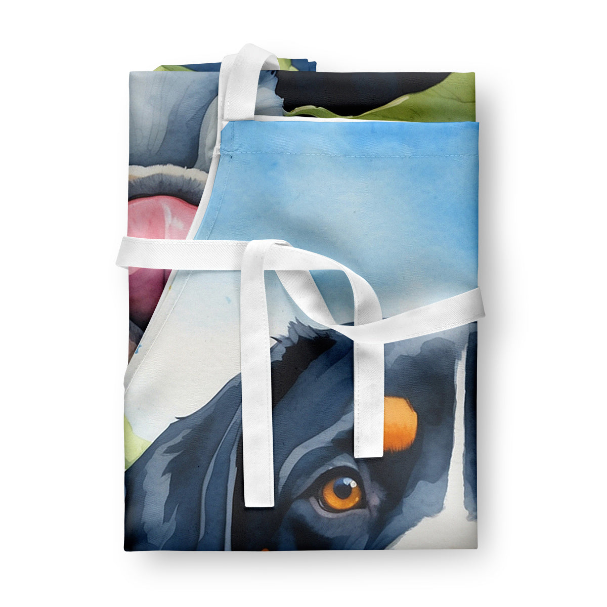 Apron featuring breed specific Greater Swiss Mountain Dog artwork. Elevate your cooking, baking, and grilling experiences with our versatile Kitchen or BBQ Apron. This Bib Style apron isn't just limited to culinary activities - it also serves as an excellent baking apron, artist apron, server apron, gardening apron, or even a dog grooming apron. The apron showcases vibrant full-color artwork contributed by one of our talented artists, bringing a dash of style to your daily tasks. With dimensions of approximately 27"W x 30"H, it provides ample coverage to protect your clothing from spills and splashes. Our apron is meticulously crafted from 100% Ultra Spun Polyester, known for its durability and lightweight nature. The apron comes with white tie straps, ensuring a comfortable and adjustable fit for all. It's a perfect choice for kitchen apron enthusiasts, whether you are a woman or a man. Designed for easy maintenance, this apron is fully machine washable. The quick-drying polyester material actively reduces staining, keeping your apron looking fresh and new for longer. Our beautifully designed apron isn't just a functional kitchen accessory - it's a fashion statement in the culinary world!
