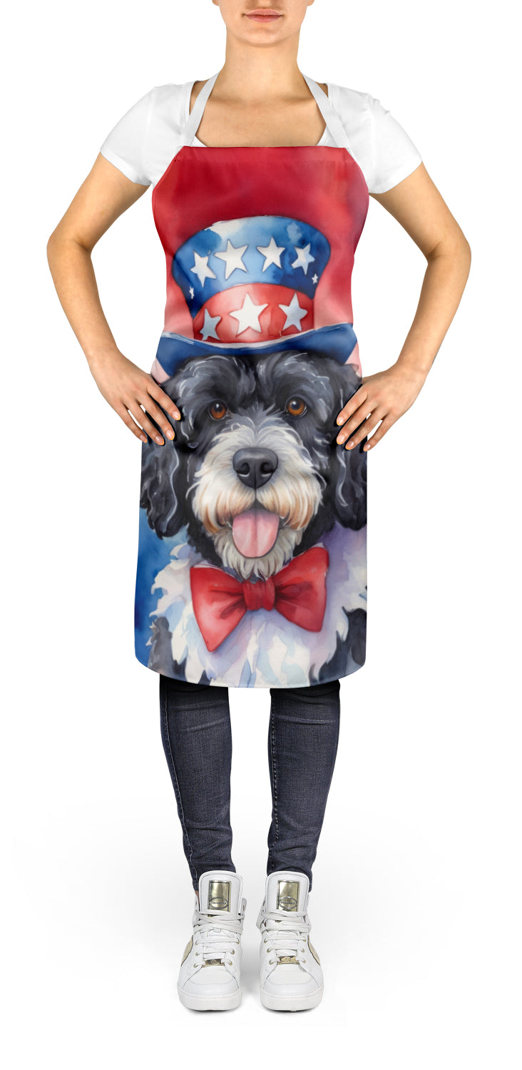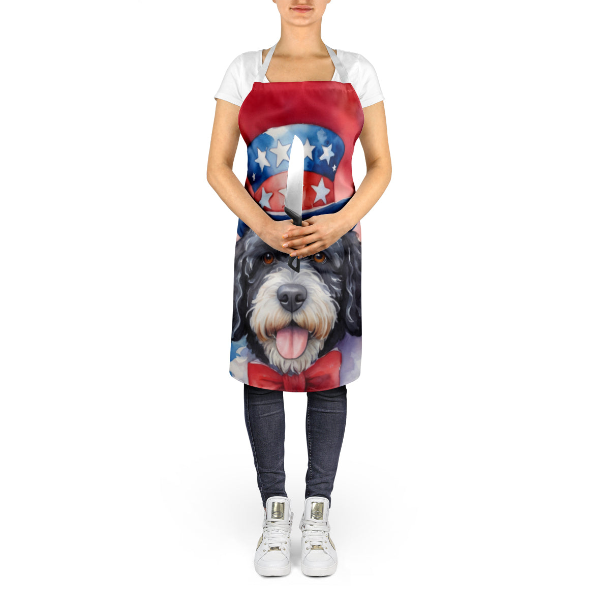 Apron featuring breed specific Portuguese Water Dog artwork. Elevate your cooking, baking, and grilling experiences with our versatile Kitchen or BBQ Apron. This Bib Style apron isn't just limited to culinary activities - it also serves as an excellent baking apron, artist apron, server apron, gardening apron, or even a dog grooming apron. The apron showcases vibrant full-color artwork contributed by one of our talented artists, bringing a dash of style to your daily tasks. With dimensions of approximately 27"W x 30"H, it provides ample coverage to protect your clothing from spills and splashes. Our apron is meticulously crafted from 100% Ultra Spun Polyester, known for its durability and lightweight nature. The apron comes with white tie straps, ensuring a comfortable and adjustable fit for all. It's a perfect choice for kitchen apron enthusiasts, whether you are a woman or a man. Designed for easy maintenance, this apron is fully machine washable. The quick-drying polyester material actively reduces staining, keeping your apron looking fresh and new for longer. Our beautifully designed apron isn't just a functional kitchen accessory - it's a fashion statement in the culinary world!
