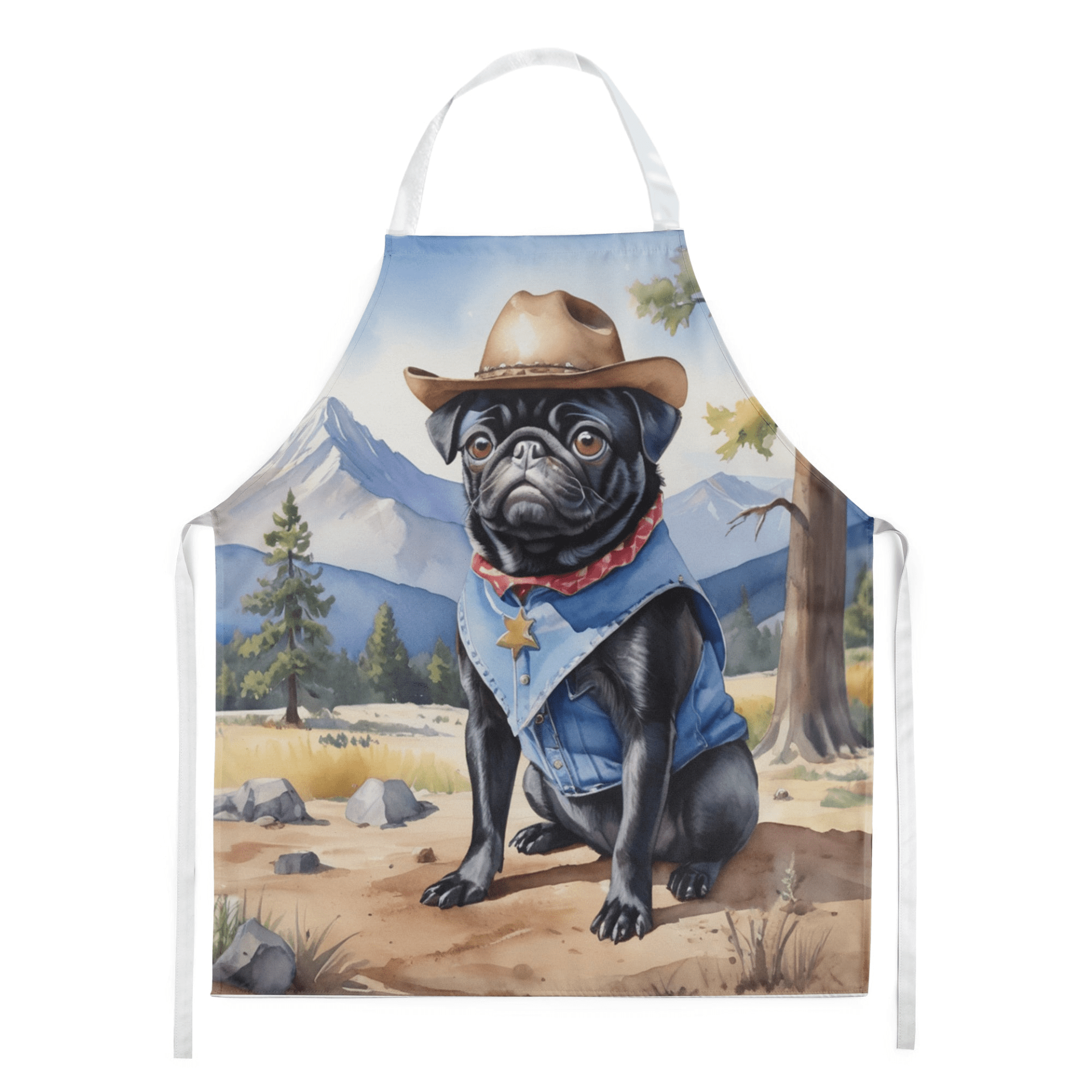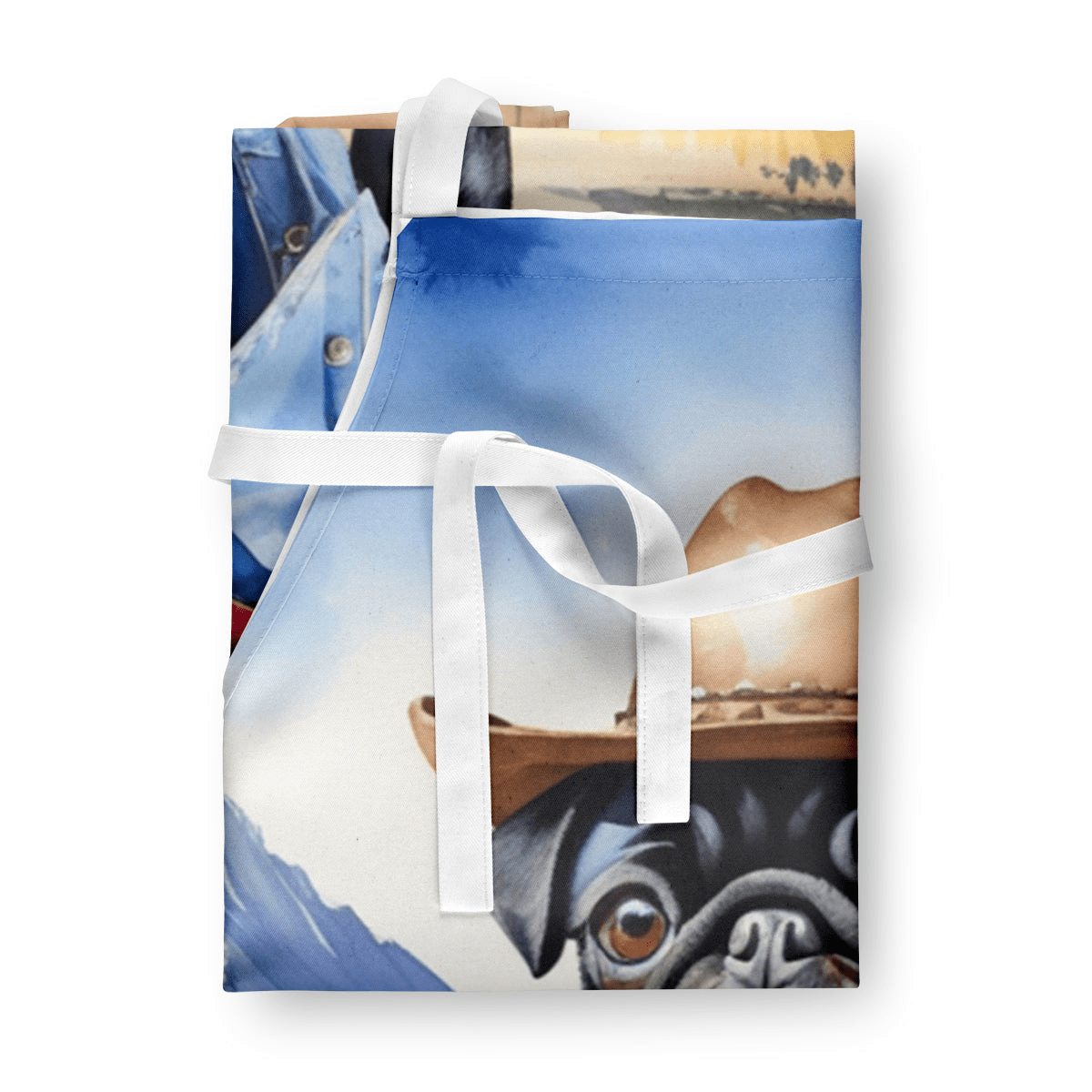 Apron featuring breed specific Pug artwork. Elevate your cooking, baking, and grilling experiences with our versatile Kitchen or BBQ Apron. This Bib Style apron isn't just limited to culinary activities - it also serves as an excellent baking apron, artist apron, server apron, gardening apron, or even a dog grooming apron. The apron showcases vibrant full-color artwork contributed by one of our talented artists, bringing a dash of style to your daily tasks. With dimensions of approximately 27"W x 30"H, it provides ample coverage to protect your clothing from spills and splashes. Our apron is meticulously crafted from 100% Ultra Spun Polyester, known for its durability and lightweight nature. The apron comes with white tie straps, ensuring a comfortable and adjustable fit for all. It's a perfect choice for kitchen apron enthusiasts, whether you are a woman or a man. Designed for easy maintenance, this apron is fully machine washable. The quick-drying polyester material actively reduces staining, keeping your apron looking fresh and new for longer. Our beautifully designed apron isn't just a functional kitchen accessory - it's a fashion statement in the culinary world!