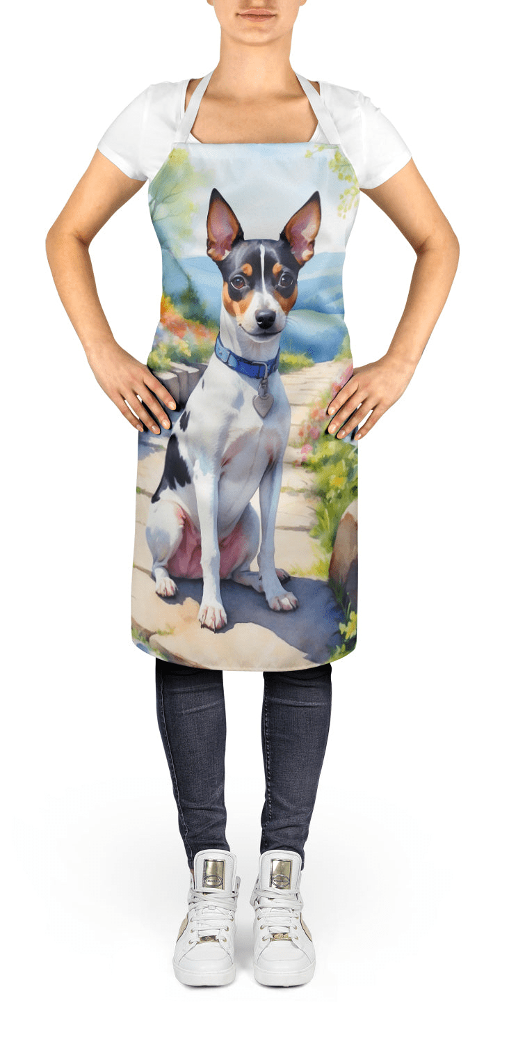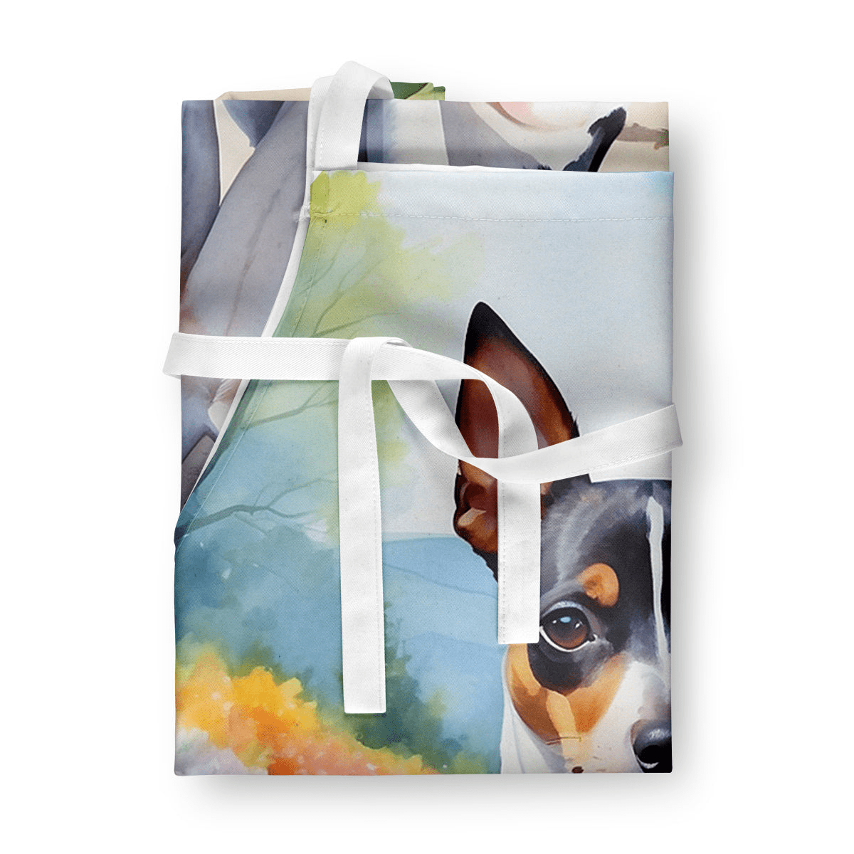 Apron featuring breed specific Rat Terrier artwork. Elevate your cooking, baking, and grilling experiences with our versatile Kitchen or BBQ Apron. This Bib Style apron isn't just limited to culinary activities - it also serves as an excellent baking apron, artist apron, server apron, gardening apron, or even a dog grooming apron. The apron showcases vibrant full-color artwork contributed by one of our talented artists, bringing a dash of style to your daily tasks. With dimensions of approximately 27"W x 30"H, it provides ample coverage to protect your clothing from spills and splashes. Our apron is meticulously crafted from 100% Ultra Spun Polyester, known for its durability and lightweight nature. The apron comes with white tie straps, ensuring a comfortable and adjustable fit for all. It's a perfect choice for kitchen apron enthusiasts, whether you are a woman or a man. Designed for easy maintenance, this apron is fully machine washable. The quick-drying polyester material actively reduces staining, keeping your apron looking fresh and new for longer. Our beautifully designed apron isn't just a functional kitchen accessory - it's a fashion statement in the culinary world!