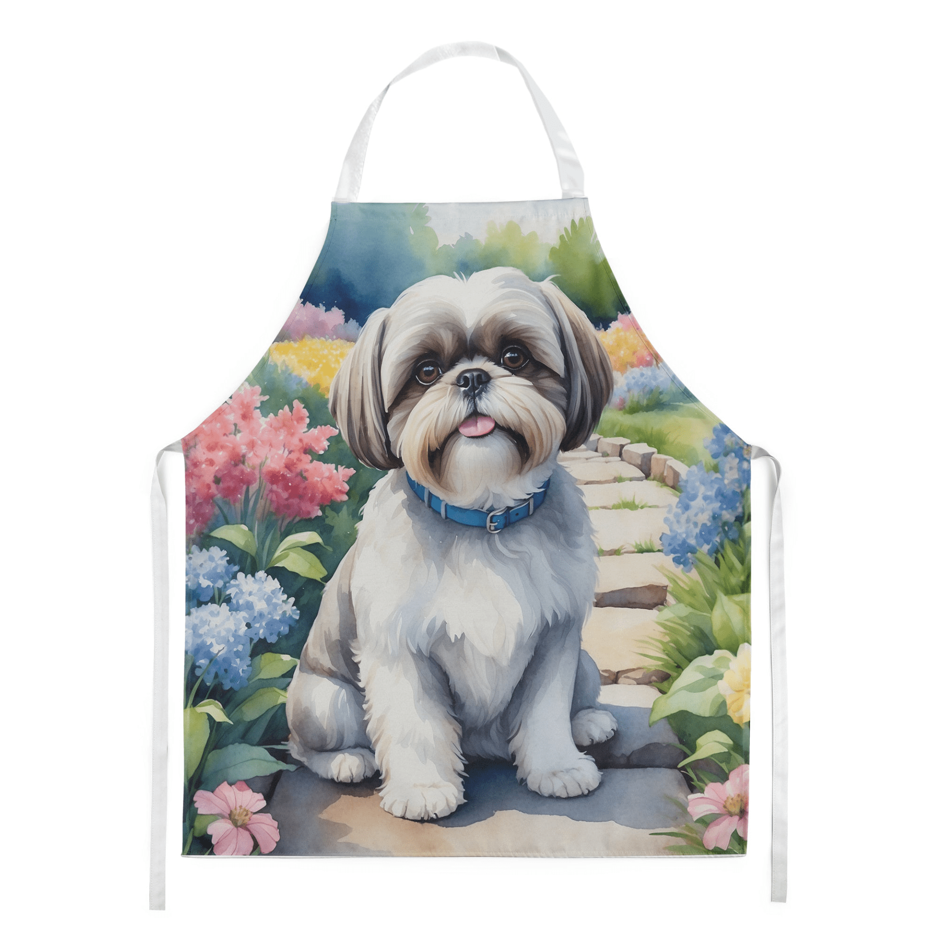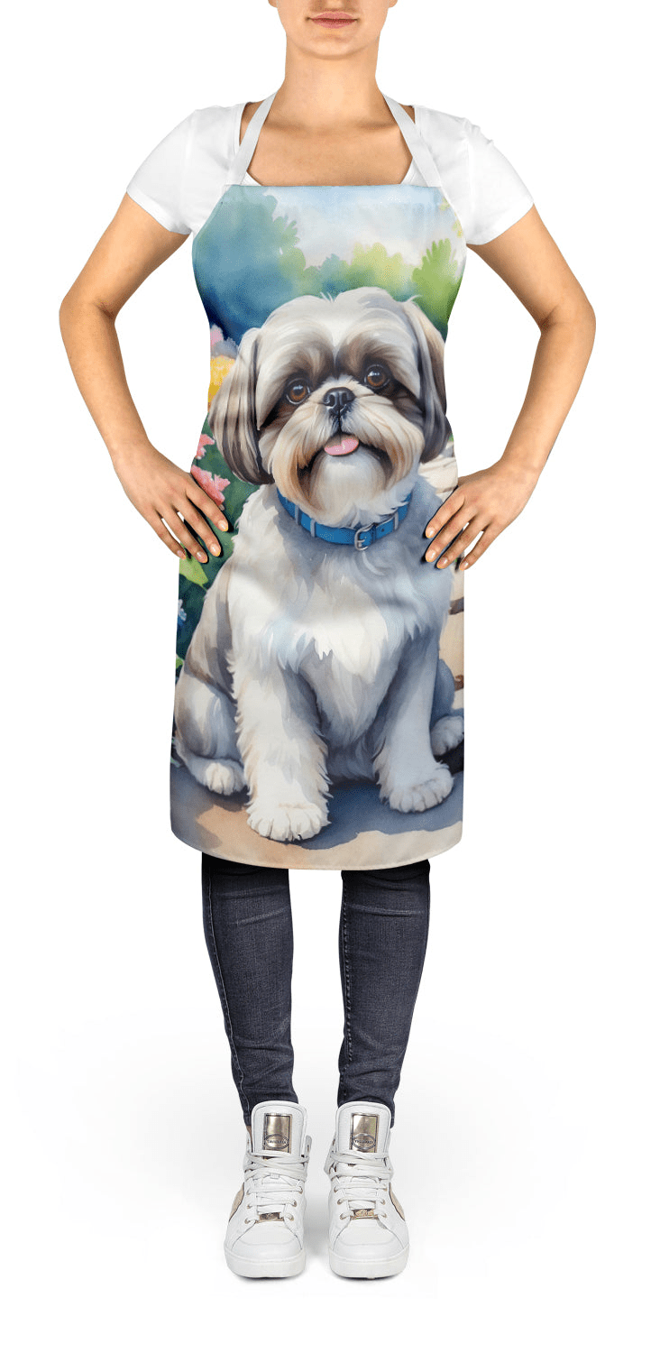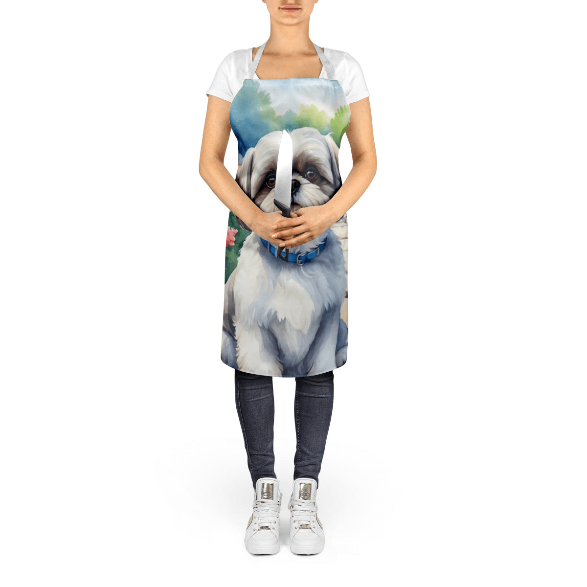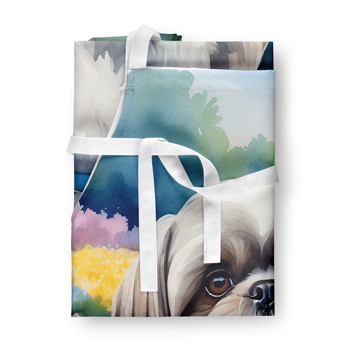 Apron featuring breed specific Shih Tzu artwork. Elevate your cooking, baking, and grilling experiences with our versatile Kitchen or BBQ Apron. This Bib Style apron isn't just limited to culinary activities - it also serves as an excellent baking apron, artist apron, server apron, gardening apron, or even a dog grooming apron. The apron showcases vibrant full-color artwork contributed by one of our talented artists, bringing a dash of style to your daily tasks. With dimensions of approximately 27"W x 30"H, it provides ample coverage to protect your clothing from spills and splashes. Our apron is meticulously crafted from 100% Ultra Spun Polyester, known for its durability and lightweight nature. The apron comes with white tie straps, ensuring a comfortable and adjustable fit for all. It's a perfect choice for kitchen apron enthusiasts, whether you are a woman or a man. Designed for easy maintenance, this apron is fully machine washable. The quick-drying polyester material actively reduces staining, keeping your apron looking fresh and new for longer. Our beautifully designed apron isn't just a functional kitchen accessory - it's a fashion statement in the culinary world!