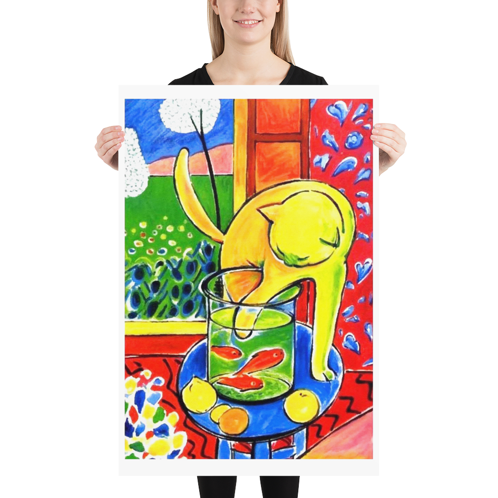 Le Chat Aux Poissons Rouges: This marvelous poster features a very famous Matisse painting, where a cat plays with red fishes. Matisse painted primarily women, but he was a cat lover. He was especially attached to his two cats: Minouche and Coussi, as well as his black cat 'La Puce', whom he fed pieces of brioche in the morning.