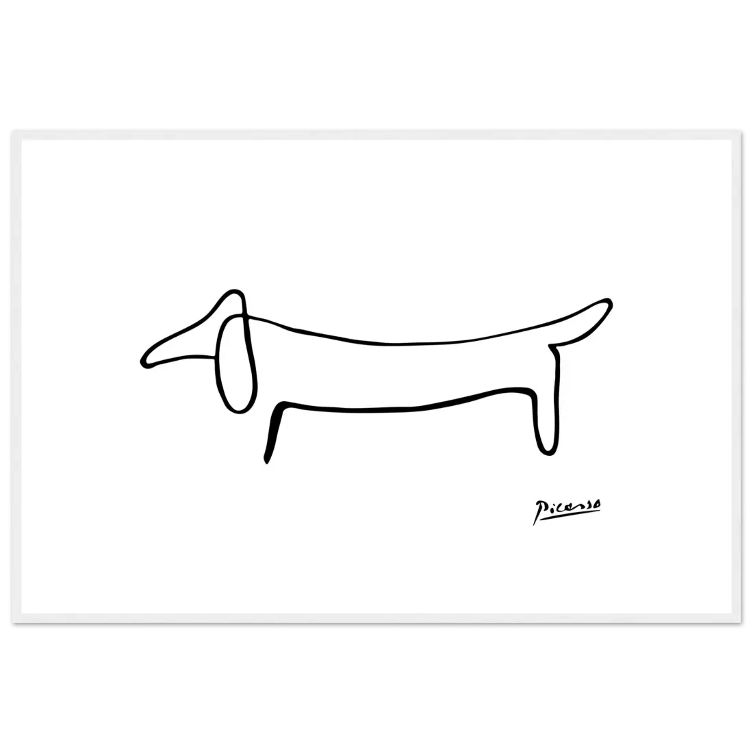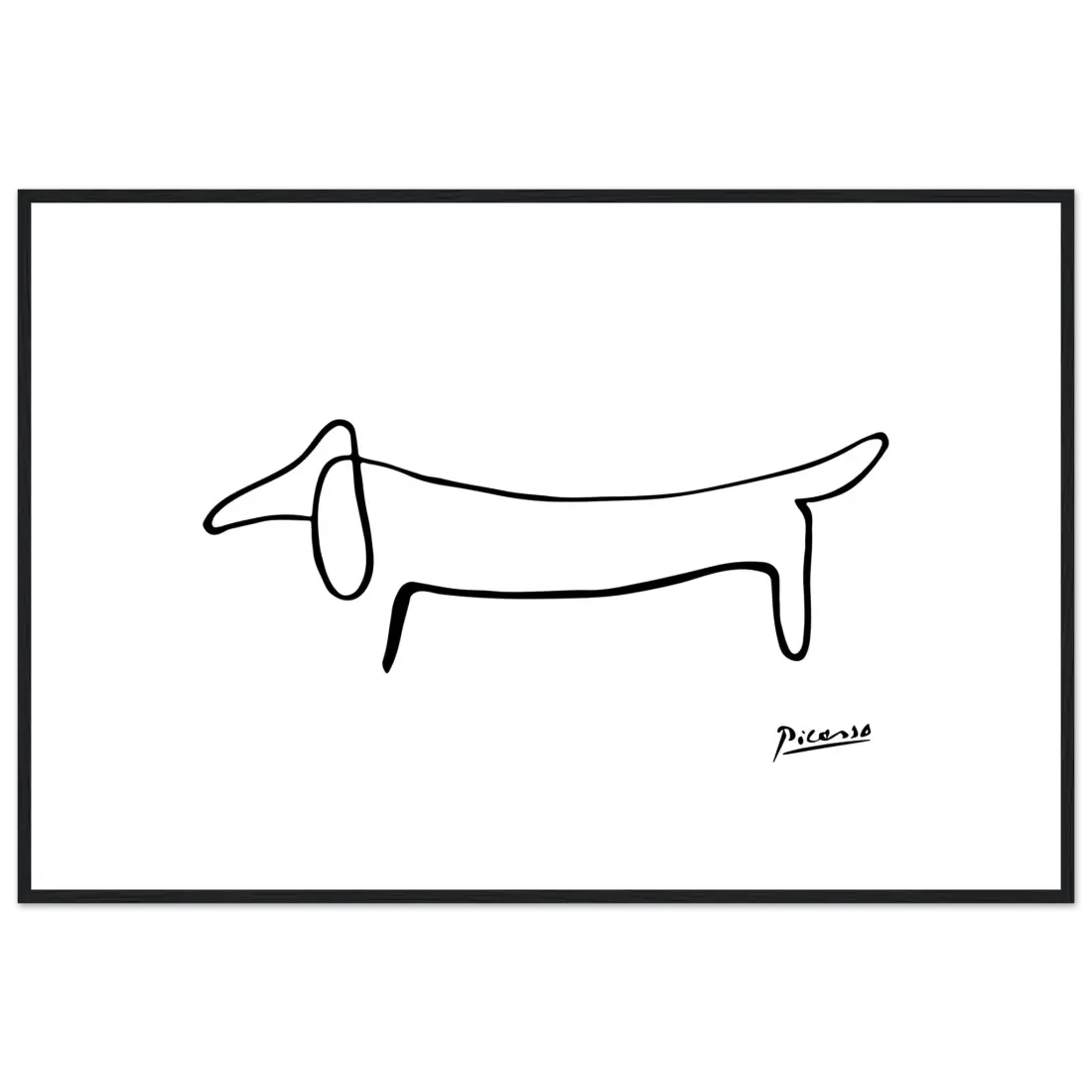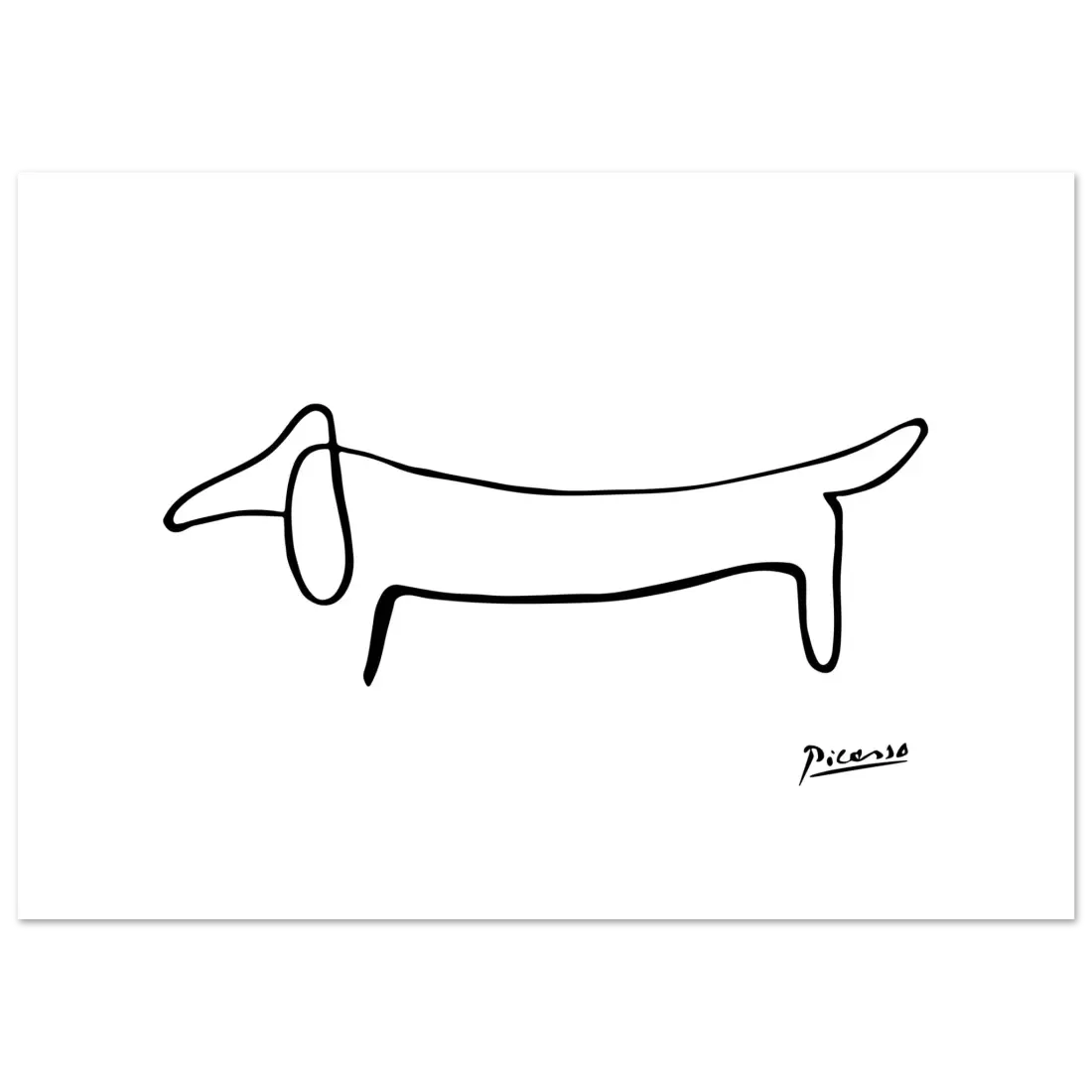 This poster is a tribute to Picasso's beloved dachshund, Lump. Unlike old masters who included artists and patrons in their works, Picasso often painted his loyal companion. This piece captures the unique bond between the maestro and his self-assured little dog.