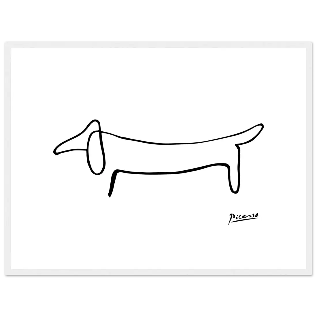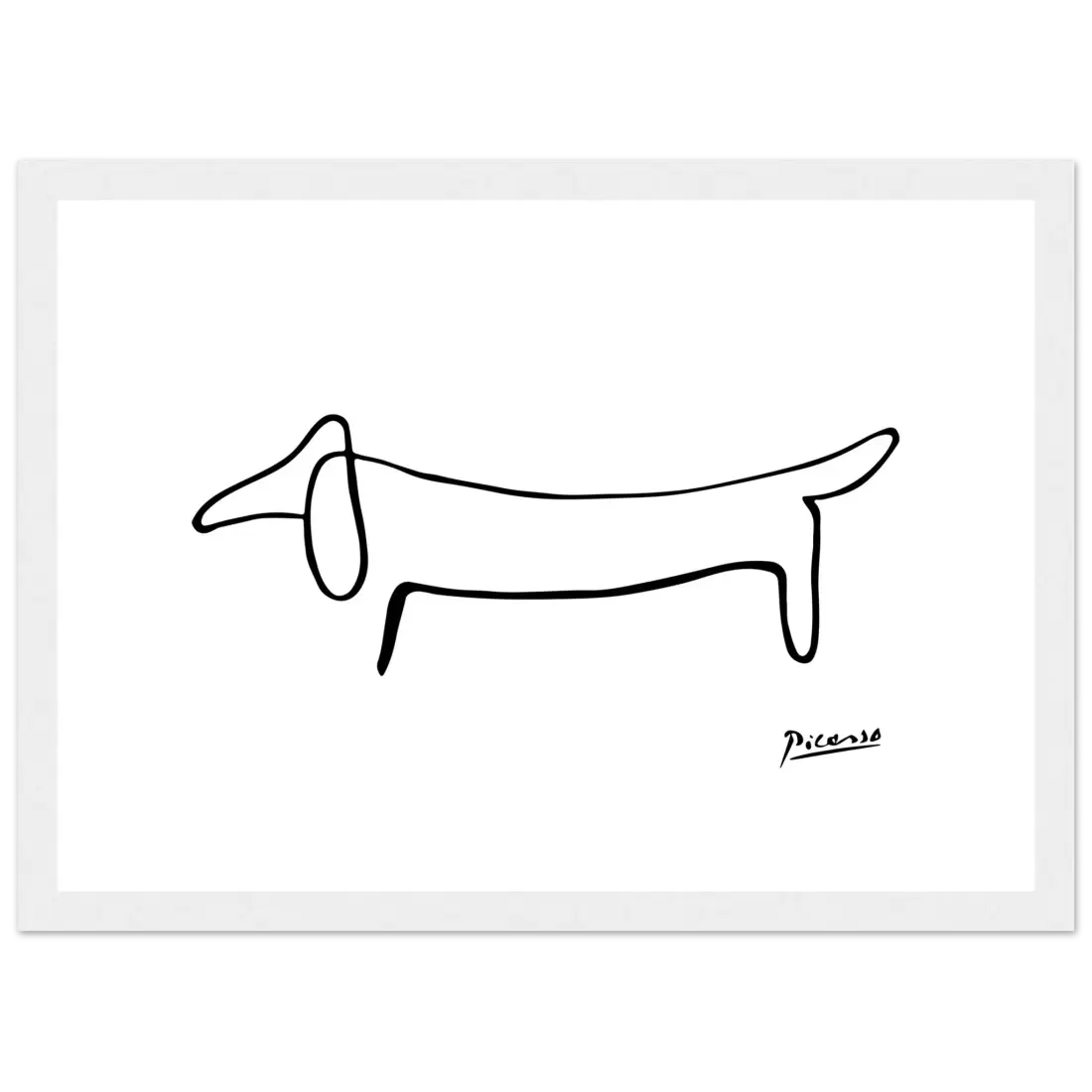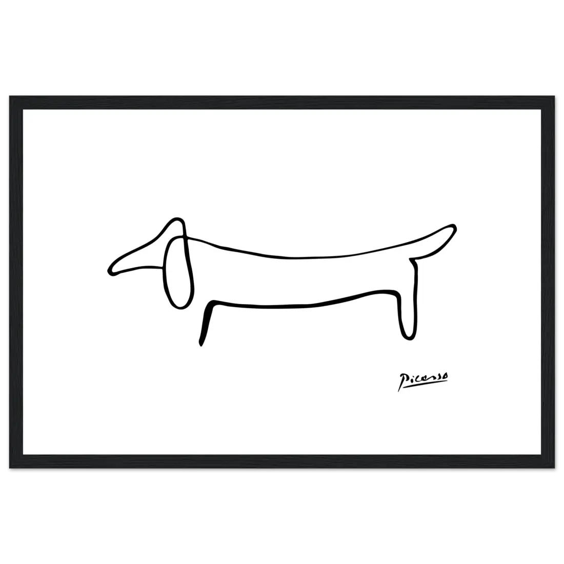 This poster is a tribute to Picasso's beloved dachshund, Lump. Unlike old masters who included artists and patrons in their works, Picasso often painted his loyal companion. This piece captures the unique bond between the maestro and his self-assured little dog.