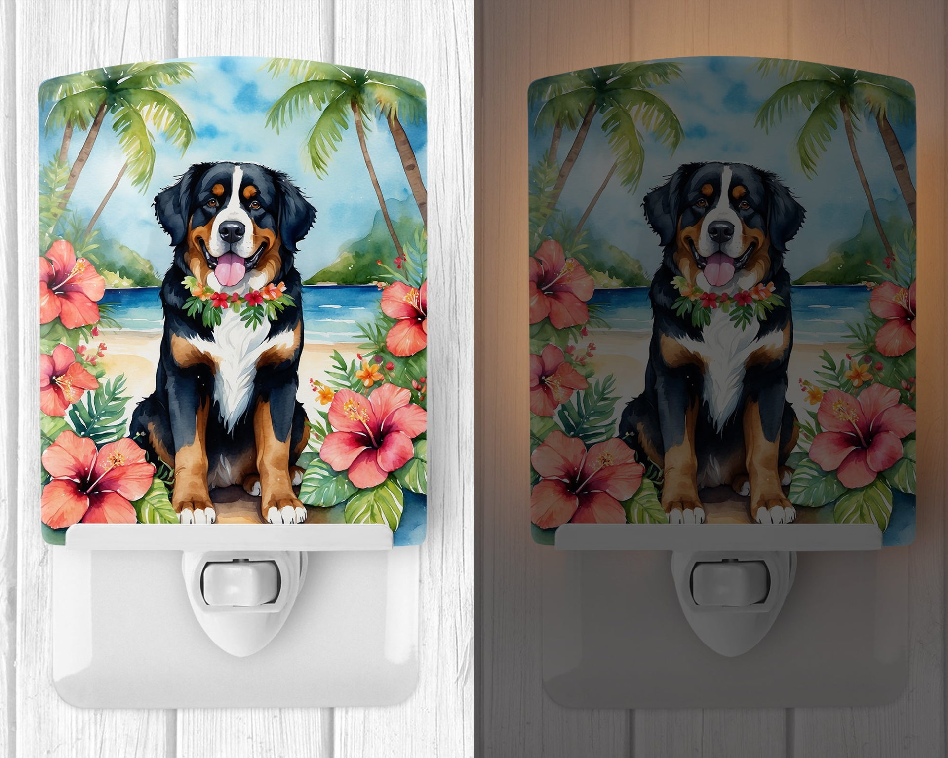 Ceramic Night Light featuring breed specific Bernese Mountain Dog artwork. Introduce a splash of artistic flair and subtle illumination to your space with the Decorative Ceramic Night Light from Caroline's Treasures. Perfect for any room, this night light seamlessly blends functionality with an aesthetic appeal, offering a stylish solution to brighten up dark corners of your home or office. Boasting a six-inch high by four-inch wide ceramic tile at the front, it showcases vivid, full-color artwork from distinguished artists, transforming a simple utility into a vibrant art piece. The artwork is securely encased in a robust metal holder, ensuring durability and longevity. Two screws are provided to firmly affix the tile into the holder. The holder extends three inches deep, housing an included bulb that emits a soft, welcoming glow. This product meets all safety standards, as evidenced by its UL approval. Proudly made in the United States from imported components, this Decorative Ceramic Night Light is not just a functional device; it's a statement piece that enhances the ambiance of your surroundings.