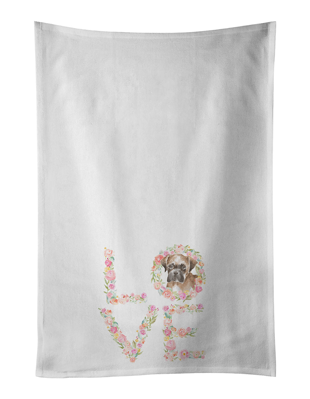 Kitchen Towel Set of 2 featuring breed specific Boxer artwork. Celebrate Valentine's Day with this Valentine's Day Kitchen Cotton Towels. This Kitchen Towel Set of 2 is from Caroline's Treasures collection LOVE. Spruce up your kitchen decor with Caroline's Treasures Decorative White Kitchen Towel Set. This set of two dish towels showcases beautiful artwork from one of our talented artists, making them both practical and visually appealing. These towels are crafted from 100% cotton, offering excellent absorbency and durability, making them ideal for any kitchen task. Each white towel measures 19 inches by 28 inches, providing ample coverage for drying dishes or wiping up spills. The standout feature of these towels is the full-color artwork design printed on each one. They can serve as a vibrant accent in your kitchen, turning a functional item into a delightful piece of decor. When it comes to care, these towels are machine washable in cold water and can be dried on low heat. Remember to always use a pressing cloth when pressing the design, and avoid using bleach on the decorated towel. The Decorative White Kitchen Towel Set makes a great gift or a stylish addition to your own kitchen.