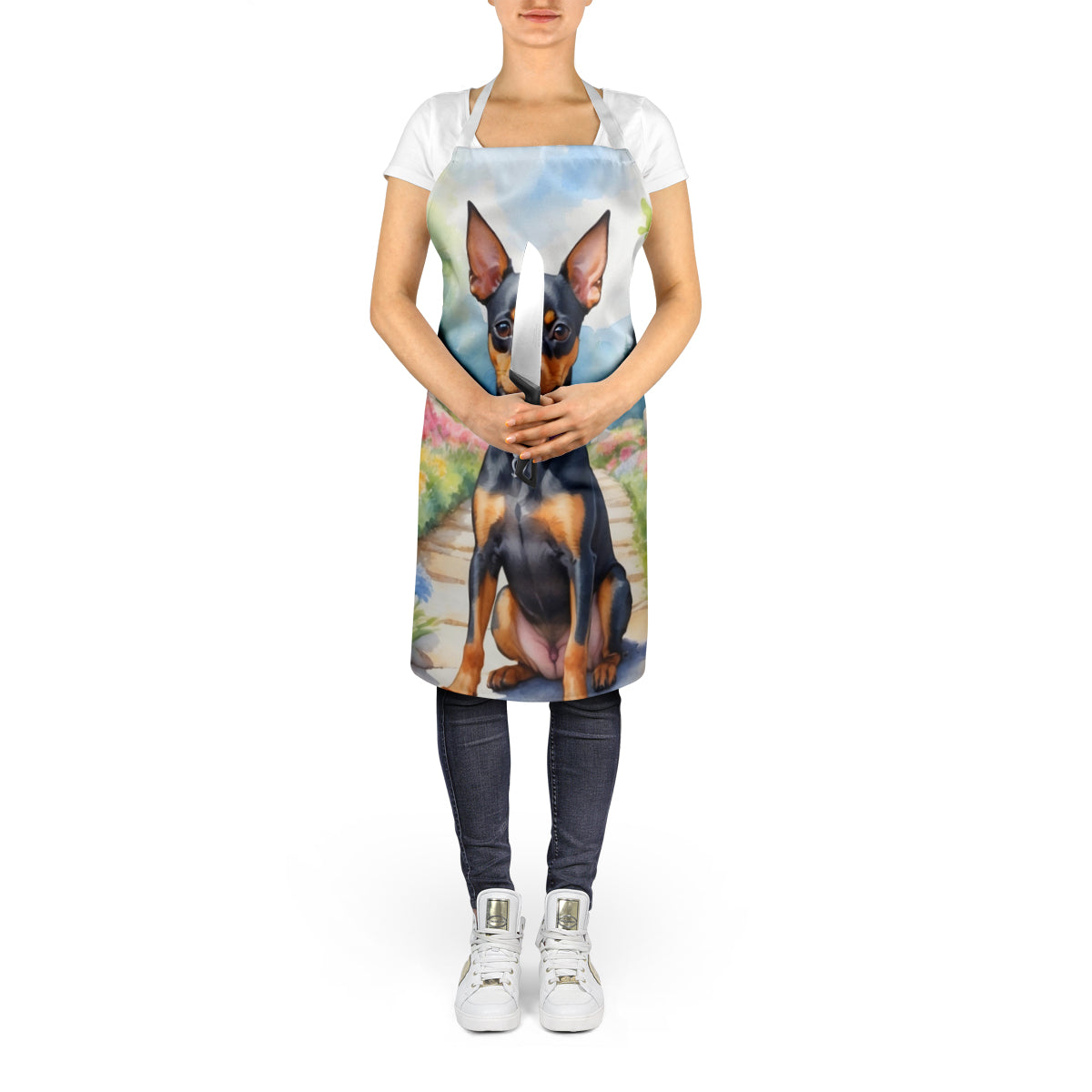 Apron featuring breed specific Miniature Pinscher artwork. Elevate your cooking, baking, and grilling experiences with our versatile Kitchen or BBQ Apron. This Bib Style apron isn't just limited to culinary activities - it also serves as an excellent baking apron, artist apron, server apron, gardening apron, or even a dog grooming apron. The apron showcases vibrant full-color artwork contributed by one of our talented artists, bringing a dash of style to your daily tasks. With dimensions of approximately 27"W x 30"H, it provides ample coverage to protect your clothing from spills and splashes. Our apron is meticulously crafted from 100% Ultra Spun Polyester, known for its durability and lightweight nature. The apron comes with white tie straps, ensuring a comfortable and adjustable fit for all. It's a perfect choice for kitchen apron enthusiasts, whether you are a woman or a man. Designed for easy maintenance, this apron is fully machine washable. The quick-drying polyester material actively reduces staining, keeping your apron looking fresh and new for longer. Our beautifully designed apron isn't just a functional kitchen accessory - it's a fashion statement in the culinary world!
