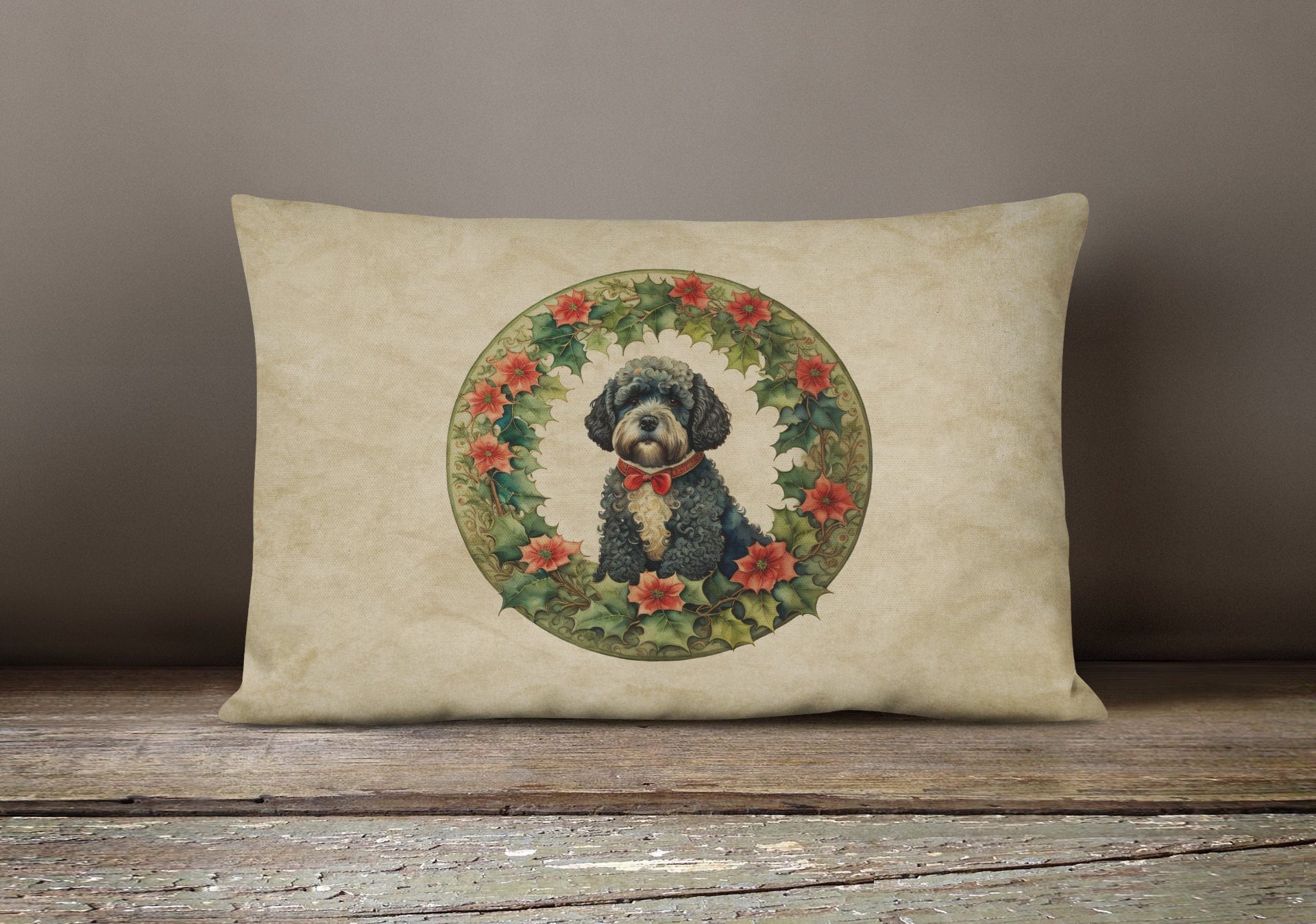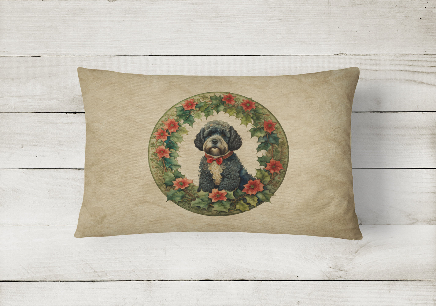 Throw Pillow featuring breed specific Portuguese Water Dog artwork. Celebrate Christmas with this Christmas Pillow. Embrace the fusion of comfort and style with Caroline's Treasures Fabric Decorative Pillow. This 12x16 inch outdoor pillow is designed to complement your patio furniture, adding a splash of color and artistry to your outdoor setting. Constructed with a 100% Polyester Fabric pillow sham filled with a plush pillow form, this cushion is as comfortable as it is durable. Our outdoor pillow utilizes a novel fabric, meticulously woven for enhanced water resistance. This soft canvas material is equally suited for your indoor couch as well as outdoor settings such as the patio, porch, or veranda. To ensure enduring vibrance, we employ colorfast dyes resistant to fading even when subjected to weather elements. The making of this pillow involves the delicate sewing together of three fabric pieces to create a sham, into which a polyester insert is carefully placed. The result is an overstuffed pillow that tenaciously holds its shape. With both the sham and the pillow insert crafted in the United States, these handmade pillows are a testament to superior local craftsmanship. Note that as these pillows are handmade, sizes may slightly vary, enhancing their unique appeal. Enjoy comfort in style with Caroline's Treasures Fabric Decorative Pillow.