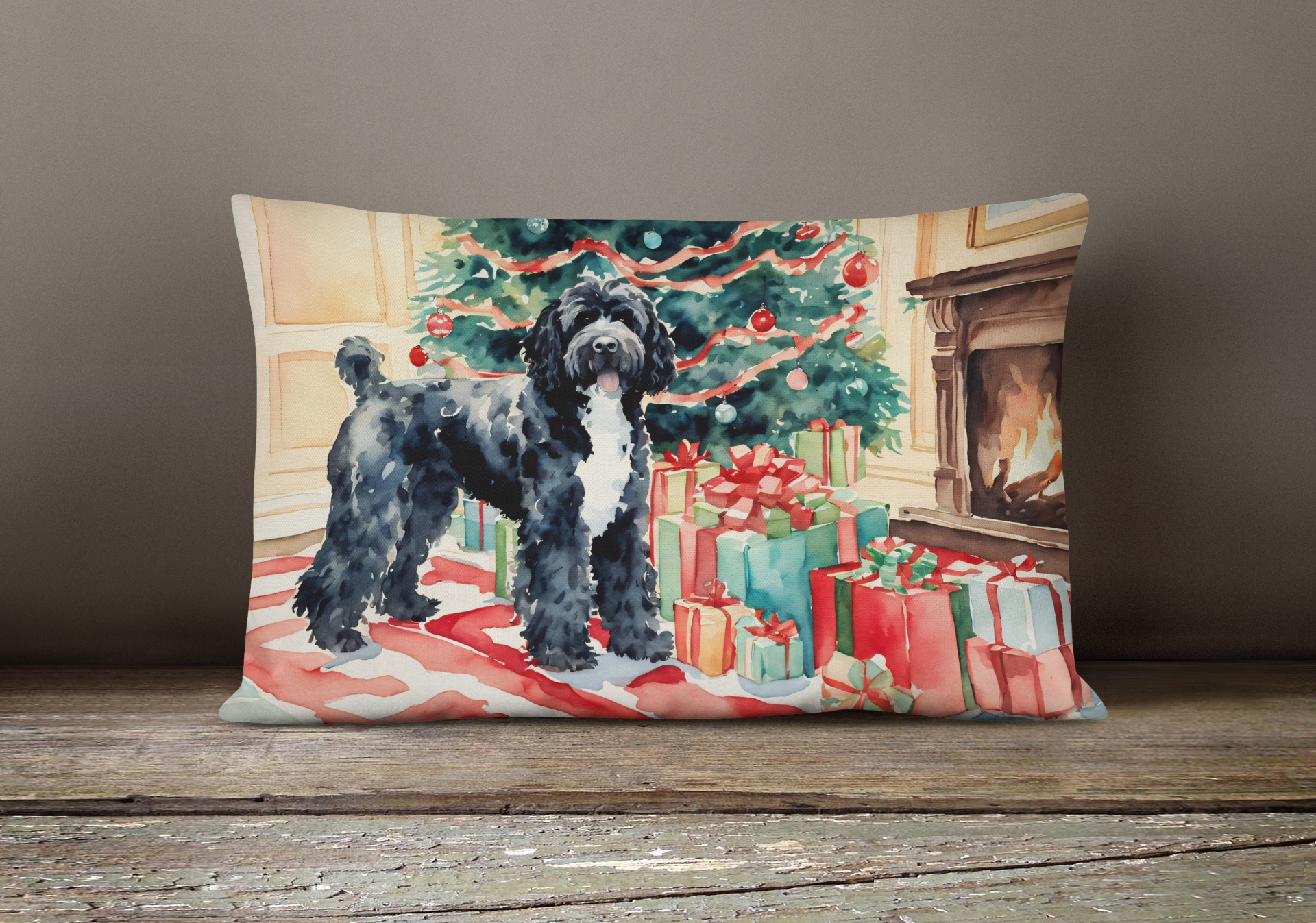 Throw Pillow featuring breed specific Portuguese Water Dog artwork. Celebrate Christmas with this Christmas Pillow. Embrace the fusion of comfort and style with Caroline's Treasures Fabric Decorative Pillow. This 12x16 inch outdoor pillow is designed to complement your patio furniture, adding a splash of color and artistry to your outdoor setting. Constructed with a 100% Polyester Fabric pillow sham filled with a plush pillow form, this cushion is as comfortable as it is durable. Our outdoor pillow utilizes a novel fabric, meticulously woven for enhanced water resistance. This soft canvas material is equally suited for your indoor couch as well as outdoor settings such as the patio, porch, or veranda. To ensure enduring vibrance, we employ colorfast dyes resistant to fading even when subjected to weather elements. The making of this pillow involves the delicate sewing together of three fabric pieces to create a sham, into which a polyester insert is carefully placed. The result is an overstuffed pillow that tenaciously holds its shape. With both the sham and the pillow insert crafted in the United States, these handmade pillows are a testament to superior local craftsmanship. Note that as these pillows are handmade, sizes may slightly vary, enhancing their unique appeal. Enjoy comfort in style with Caroline's Treasures Fabric Decorative Pillow.