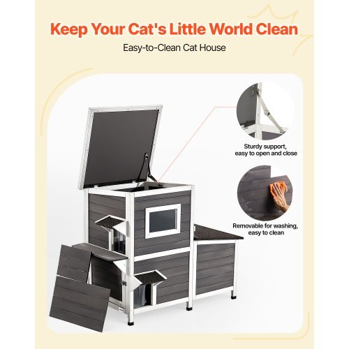 Outdoor Cat House, 2-Story Wooden Cat Shelter for 3 Outside Cats in Winter, Elevated Feral Kitty Shelter with Stairs, Clear Window & Flap Doors, Waterproof Cats Condos for Garden 42 25 34 in