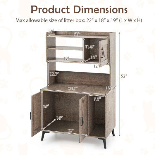 Specifications: Color Oak/White Material Engineered Board MDF Metal Product Dimensions 31.5" x 18" x 52" Maximum allowable size of litter box 22" x 18" x 19" Weight Capacity of the Bottom Cabinet 66 lbs Weight Capacity of the Countertop 66 lbs Weight Capacity of Shelves 55 lbs Net Weight 64 lbs Box QTY 1 Package Includes 1 x Cat Litter Box Enclosure with Shelves,1 x User's Manual