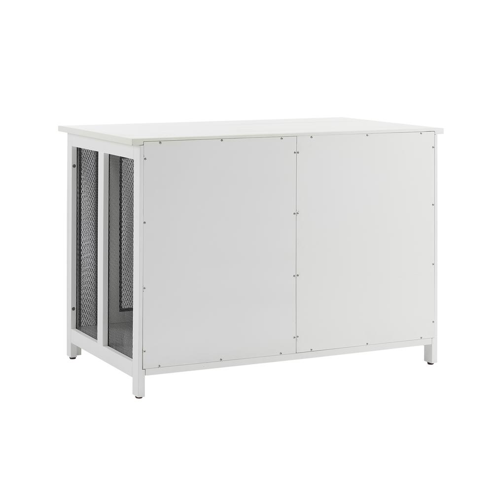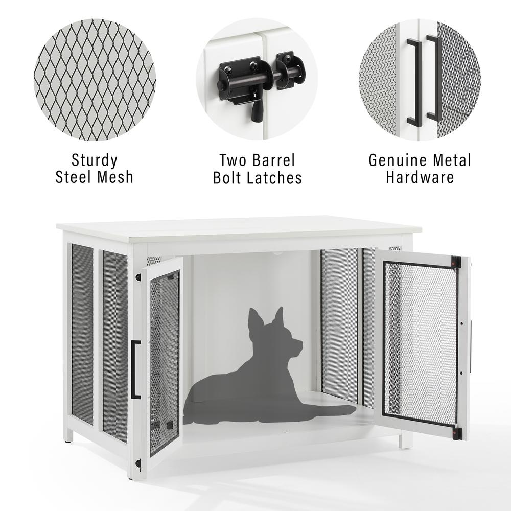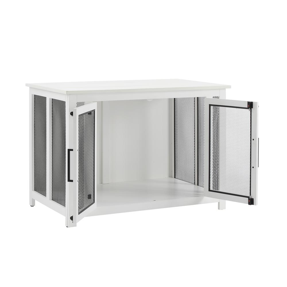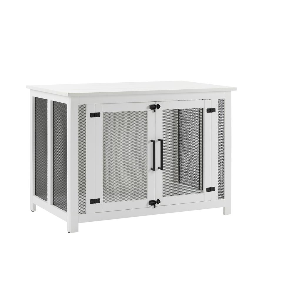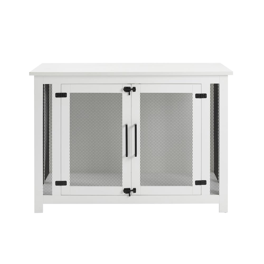 White pet crate with black genuine metal hardware Two classic barrel bolt latches and sturdy steel black mesh on the dog kennel Can fit pet beds up to 30"W x 20"D Designed for small to medium-sized pets Only recommended for well-behaved, crate-trained pets - not ideal for passionate chewers, escape artists, or accident-prone animals Pairs well with modern farmhouse decor Credenza top weight limit is 100lbs Interior Pet Storage Dimensions: 38.5"W x 23.25"D x 25.25"H, supports up to 100 lbs.