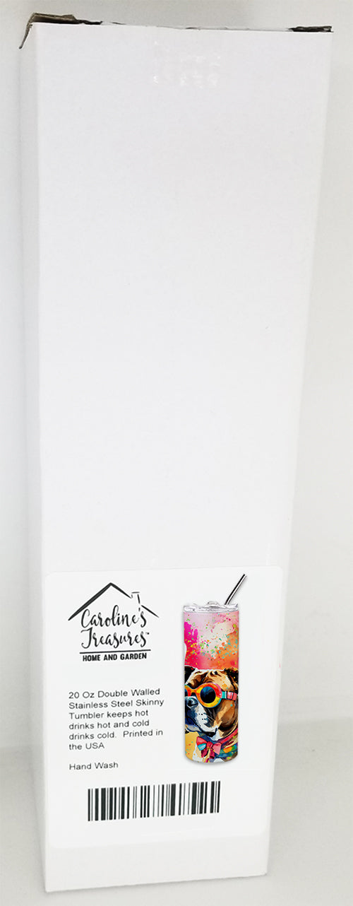 Stainless Steel Skinny Tumbler featuring breed specific Boxer artwork. Elevate your hydration experience with our Decorative Stainless Steel 20 oz Skinny Tumbler from Caroline's Treasures. This vacuum-insulated, double-walled travel mug is designed to keep your beverages hot or cold for prolonged periods, making it perfect for your coffee, tea, or cocktails. Its sleek and easy-to-grasp design, complemented by the vibrant, top-to-bottom artwork, makes it a stylish accessory for both men and women. Equipped with a secure, slide-open lid, you can enjoy your drinks without worrying about spills, while the included reusable metal straw contributes to reducing plastic use and promoting sustainability. Crafted with quality stainless steel, the tumbler is 100% BPA and Phthalate free, ensuring a safe, non-toxic experience with every sip. Not just functional, this skinny tumbler, complete with gift box, serves as a thoughtful gift for women, mothers, or any loved one. Enjoy your favorite beverages on the go in style, while making a positive impact on the environment. Remember, it's not just a drinkware, it's a lifestyle accessory! Please note: For optimum longevity, hand washing is recommended.