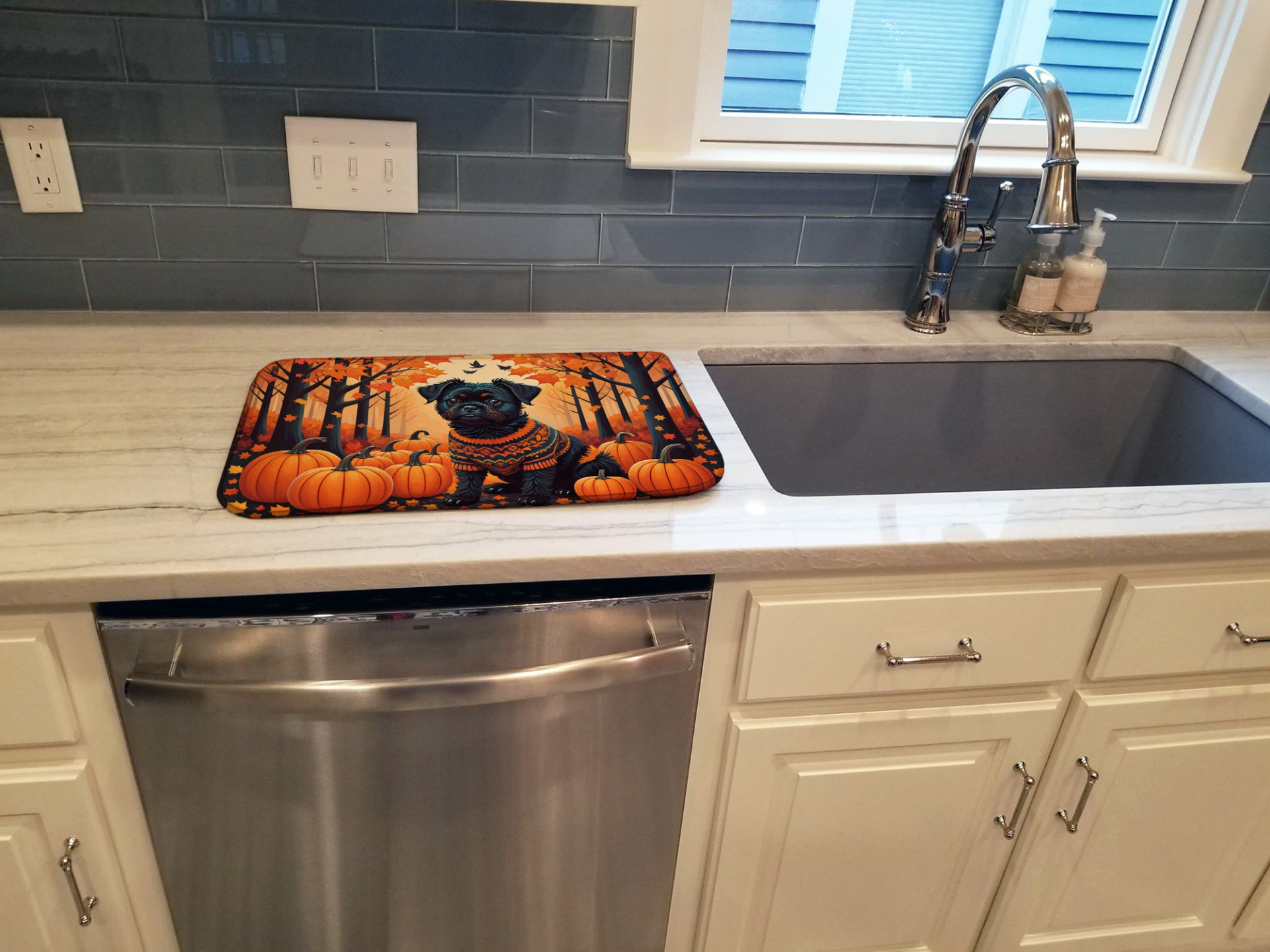 Dish Drying Mat featuring breed specific Affenpinscher artwork. Say goodbye to messy countertops and soggy dish towels with our innovative dish drying mat. Our high-quality dish drying pad is designed to keep your countertops dry while offering a stylish and efficient solution. Whether you're air drying dishes, glasses, stemware, silverware, pots, pans, bottles, or even fruits and vegetables, our dish mat is the perfect choice. The 14 inches x 22 inches size fits most counters and dish drying racks, and the non-slip design ensures stability. Made with water-absorbent polyester and a polyurethane foam insert, our dish drying mat is not only functional but also durable. It's machine washable and printed in the USA for long-lasting use. The beautiful artwork adds flair to your kitchen decor, making it a perfect housewarming gift or present for any occasion. Upgrade your kitchen experience with our absorbent and versatile dish drying mat.