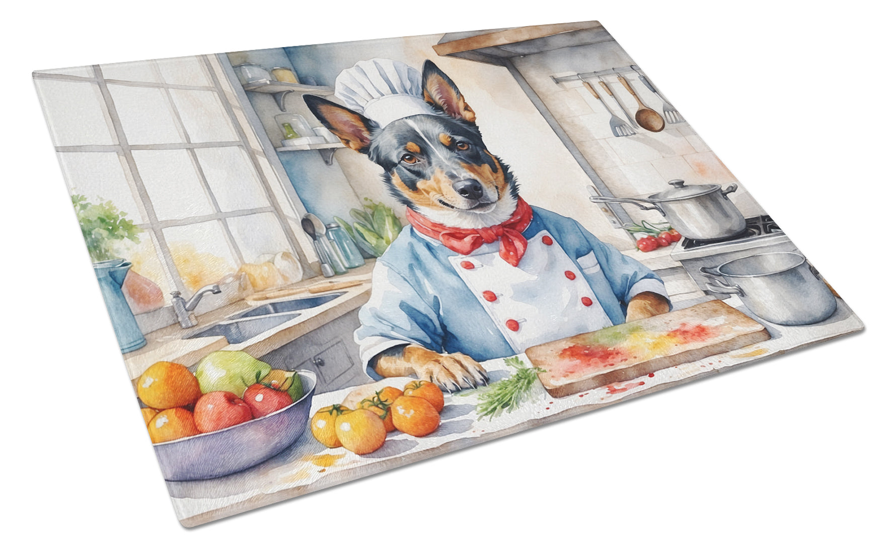 Glass Cutting Board featuring breed specific Australian Cattle Dog artwork. Introduce your kitchen to the vibrant, large Decorative Glass Cutting Board from Caroline's Treasures. Crafted from resilient tempered glass, this board is not only a utilitarian necessity but also a colorful art piece. With its generous dimensions of 15 inches in height and 12 inches in length, it offers ample space for all your cutting needs. Every piece showcases captivating artwork from distinguished artists, bringing an aesthetic edge to your kitchen. Beyond its attractive design, this cutting board ensures your countertop stays pristine and unscathed, owing to its heat-resistant properties. Engineered with user convenience in mind, it features non-skid feet for stability, and rounded corners for additional safety. Its robust construction renders it virtually unbreakable, guaranteeing longevity. The board comes with protective feet bumpers, maintaining its position during use. This product is recommended to be hand washed only. Proudly printed and assembled in the United States, this cutting board exemplifies superior craftsmanship. With Caroline's Treasures' Decorative Glass Cutting Board, you're investing in a blend of functionality and artistic flair.