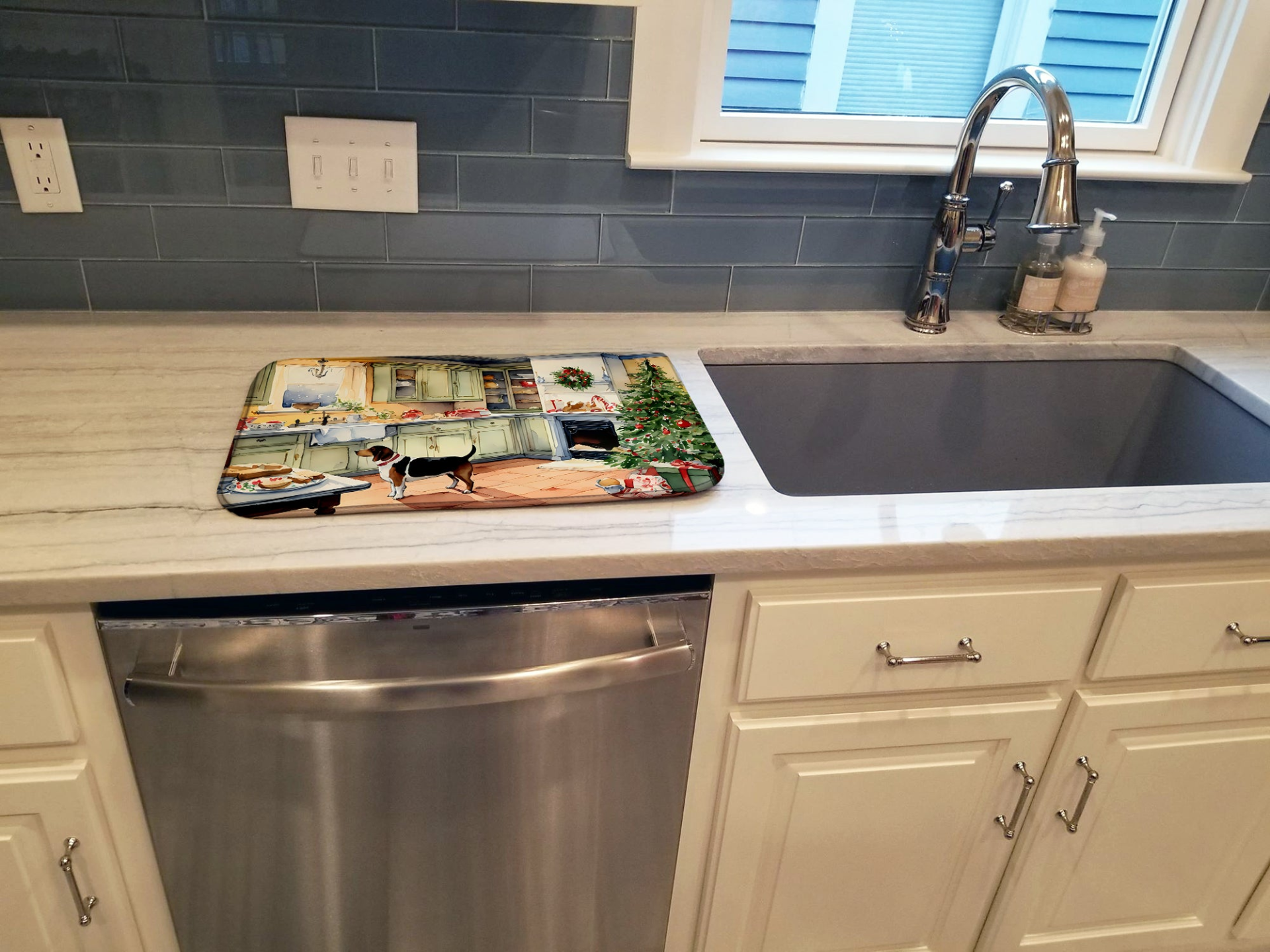 Dish Drying Mat featuring breed specific Basset Hound artwork. Celebrate Christmas with this Christmas Dish Drying Mat. Say goodbye to messy countertops and soggy dish towels with our innovative dish drying mat. Our high-quality dish drying pad is designed to keep your countertops dry while offering a stylish and efficient solution. Whether you're air drying dishes, glasses, stemware, silverware, pots, pans, bottles, or even fruits and vegetables, our dish mat is the perfect choice. The 14 inches x 22 inches size fits most counters and dish drying racks, and the non-slip design ensures stability. Made with water-absorbent polyester and a polyurethane foam insert, our dish drying mat is not only functional but also durable. It's machine washable and printed in the USA for long-lasting use. The beautiful artwork adds flair to your kitchen decor, making it a perfect housewarming gift or present for any occasion. Upgrade your kitchen experience with our absorbent and versatile dish drying mat.