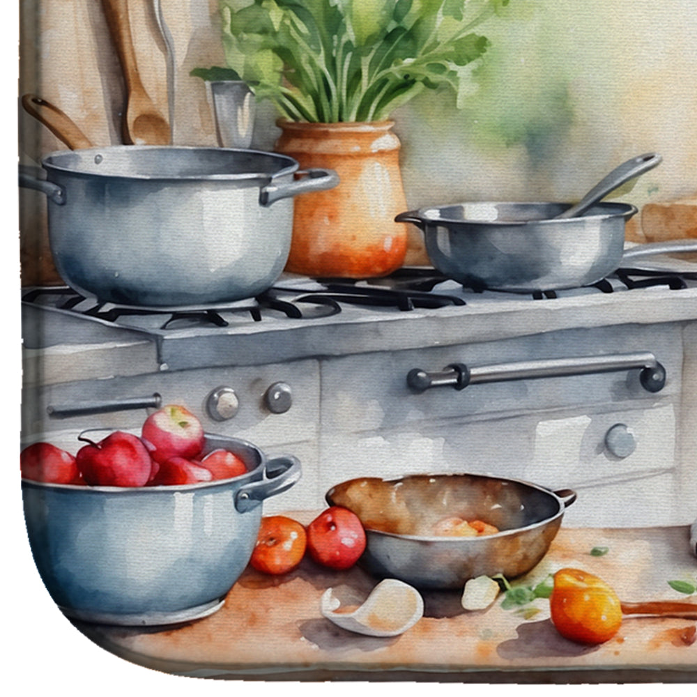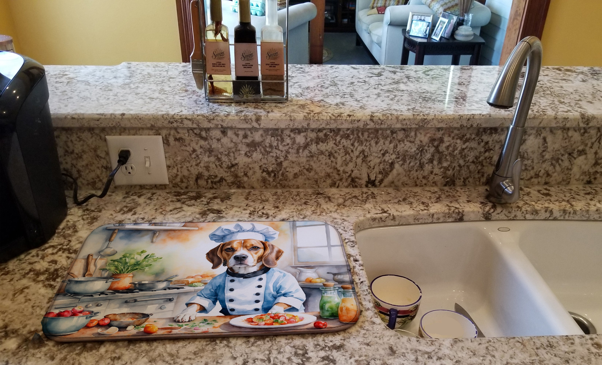 Dish Drying Mat featuring breed specific Beagle artwork. Say goodbye to messy countertops and soggy dish towels with our innovative dish drying mat. Our high-quality dish drying pad is designed to keep your countertops dry while offering a stylish and efficient solution. Whether you're air drying dishes, glasses, stemware, silverware, pots, pans, bottles, or even fruits and vegetables, our dish mat is the perfect choice. The 14 inches x 22 inches size fits most counters and dish drying racks, and the non-slip design ensures stability. Made with water-absorbent polyester and a polyurethane foam insert, our dish drying mat is not only functional but also durable. It's machine washable and printed in the USA for long-lasting use. The beautiful artwork adds flair to your kitchen decor, making it a perfect housewarming gift or present for any occasion. Upgrade your kitchen experience with our absorbent and versatile dish drying mat.