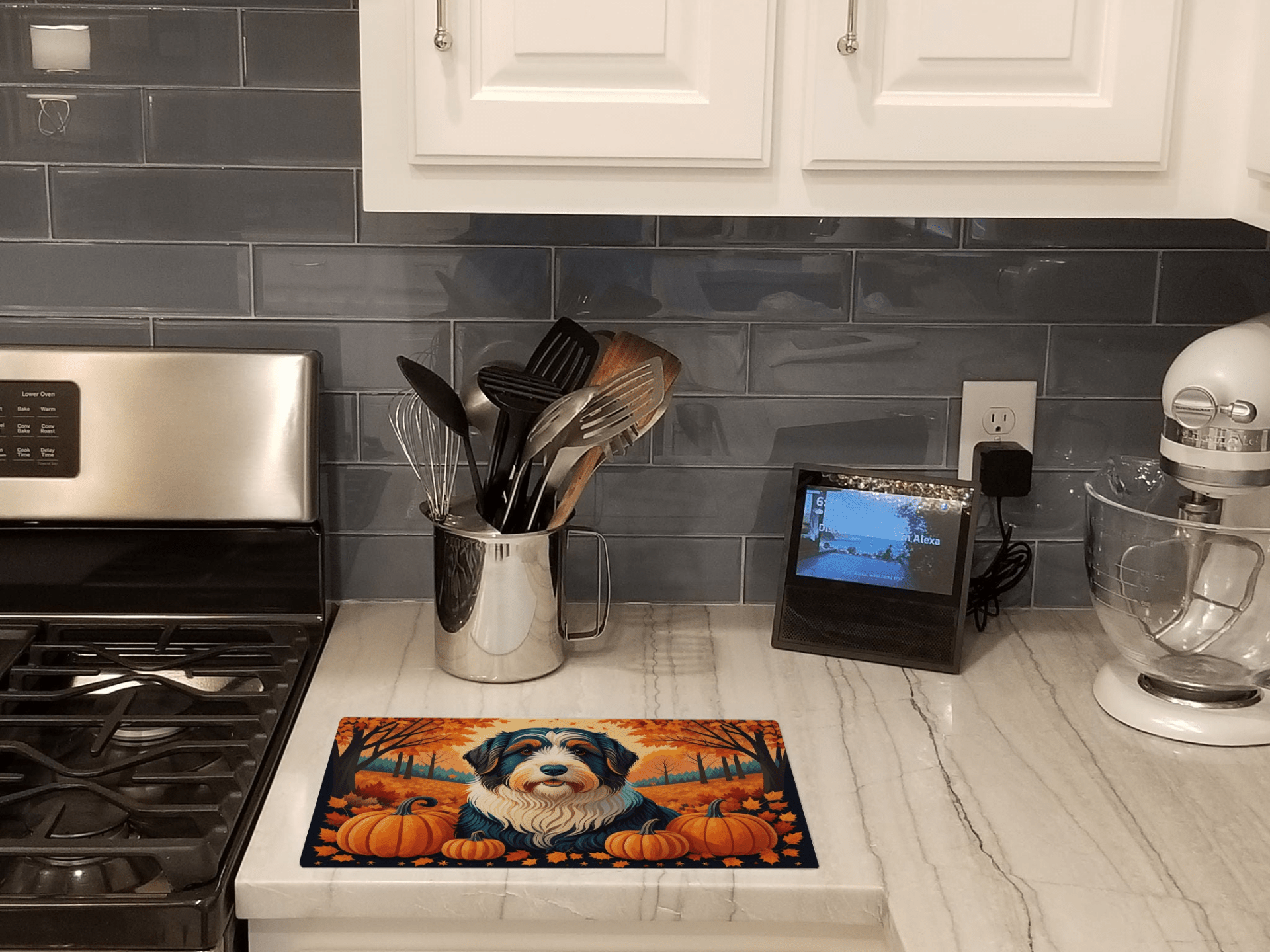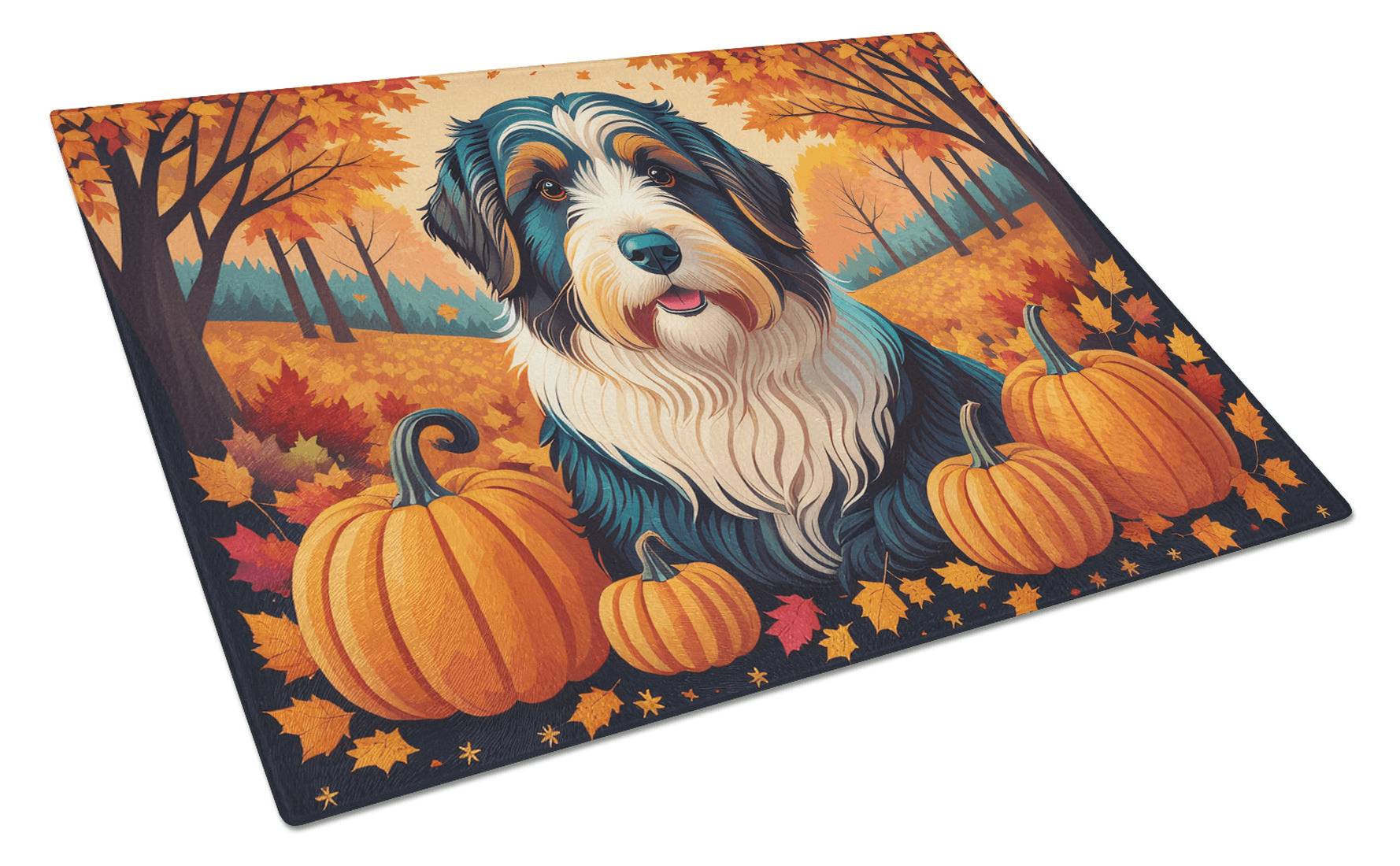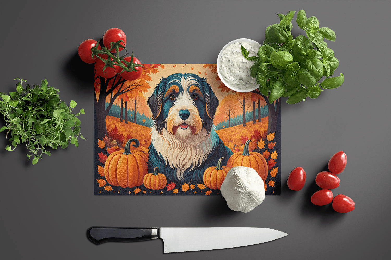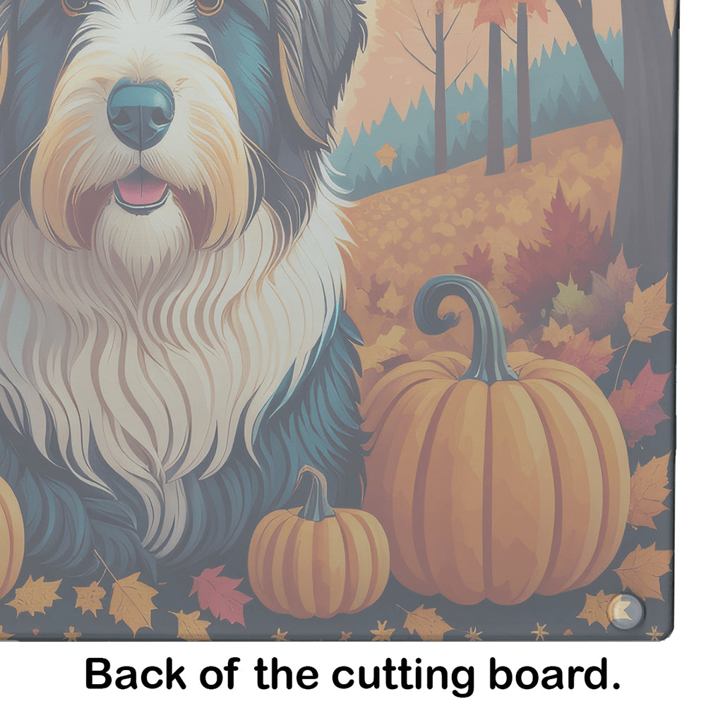 Glass Cutting Board featuring breed specific Bearded Collie artwork. Introduce your kitchen to the vibrant, large Decorative Glass Cutting Board from Caroline's Treasures. Crafted from resilient tempered glass, this board is not only a utilitarian necessity but also a colorful art piece. With its generous dimensions of 15 inches in height and 12 inches in length, it offers ample space for all your cutting needs. Every piece showcases captivating artwork from distinguished artists, bringing an aesthetic edge to your kitchen. Beyond its attractive design, this cutting board ensures your countertop stays pristine and unscathed, owing to its heat-resistant properties. Engineered with user convenience in mind, it features non-skid feet for stability, and rounded corners for additional safety. Its robust construction renders it virtually unbreakable, guaranteeing longevity. The board comes with protective feet bumpers, maintaining its position during use. This product is recommended to be hand washed only. Proudly printed and assembled in the United States, this cutting board exemplifies superior craftsmanship. With Caroline's Treasures' Decorative Glass Cutting Board, you're investing in a blend of functionality and artistic flair.