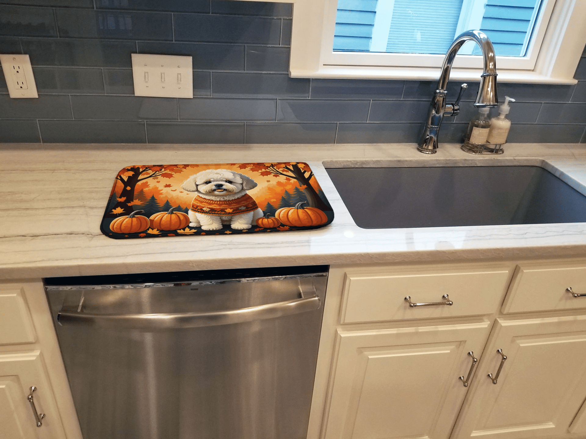 Say goodbye to soggy countertops and hello to seasonal charm with this Bichon Frise Fall Dish Drying Mat. Crafted to absorb moisture quickly and protect surfaces, it keeps your kitchen looking neat while showcasing a beloved breed. Perfect for daily use, it blends luxury with practicality so your home feels warm and inviting. ✨ Key Features
