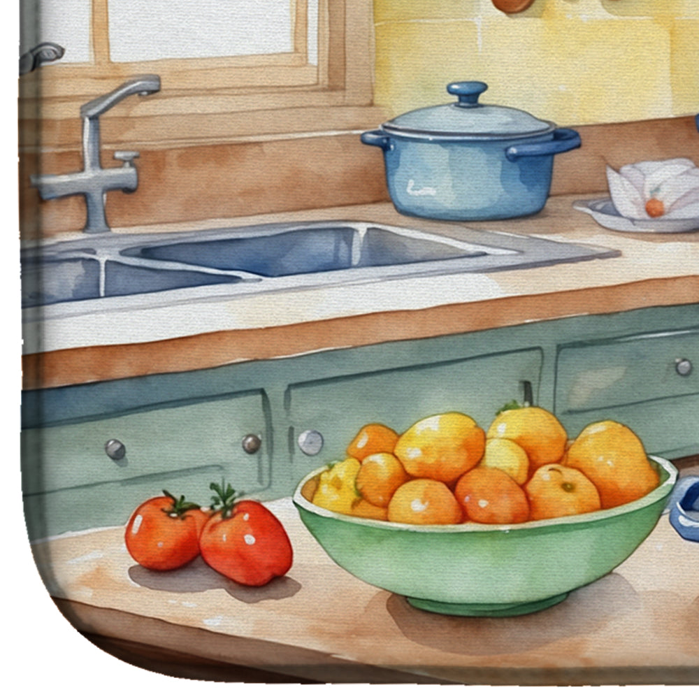 Dish Drying Mat featuring breed specific Boykin Spaniel artwork. Say goodbye to messy countertops and soggy dish towels with our innovative dish drying mat. Our high-quality dish drying pad is designed to keep your countertops dry while offering a stylish and efficient solution. Whether you're air drying dishes, glasses, stemware, silverware, pots, pans, bottles, or even fruits and vegetables, our dish mat is the perfect choice. The 14 inches x 22 inches size fits most counters and dish drying racks, and the non-slip design ensures stability. Made with water-absorbent polyester and a polyurethane foam insert, our dish drying mat is not only functional but also durable. It's machine washable and printed in the USA for long-lasting use. The beautiful artwork adds flair to your kitchen decor, making it a perfect housewarming gift or present for any occasion. Upgrade your kitchen experience with our absorbent and versatile dish drying mat.