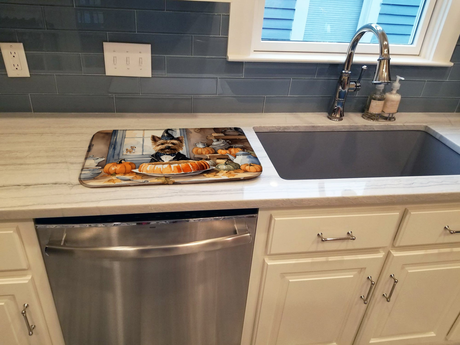 Dish Drying Mat featuring breed specific Cairn Terrier artwork. Celebrate Halloween with this Halloween Dish Drying Mat. Say goodbye to messy countertops and soggy dish towels with our innovative dish drying mat. Our high-quality dish drying pad is designed to keep your countertops dry while offering a stylish and efficient solution. Whether you're air drying dishes, glasses, stemware, silverware, pots, pans, bottles, or even fruits and vegetables, our dish mat is the perfect choice. The 14 inches x 22 inches size fits most counters and dish drying racks, and the non-slip design ensures stability. Made with water-absorbent polyester and a polyurethane foam insert, our dish drying mat is not only functional but also durable. It's machine washable and printed in the USA for long-lasting use. The beautiful artwork adds flair to your kitchen decor, making it a perfect housewarming gift or present for any occasion. Upgrade your kitchen experience with our absorbent and versatile dish drying mat.
