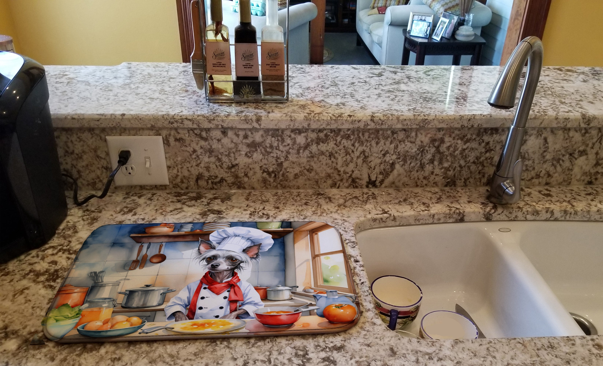 Dish Drying Mat featuring breed specific Chinese Crested artwork. Say goodbye to messy countertops and soggy dish towels with our innovative dish drying mat. Our high-quality dish drying pad is designed to keep your countertops dry while offering a stylish and efficient solution. Whether you're air drying dishes, glasses, stemware, silverware, pots, pans, bottles, or even fruits and vegetables, our dish mat is the perfect choice. The 14 inches x 22 inches size fits most counters and dish drying racks, and the non-slip design ensures stability. Made with water-absorbent polyester and a polyurethane foam insert, our dish drying mat is not only functional but also durable. It's machine washable and printed in the USA for long-lasting use. The beautiful artwork adds flair to your kitchen decor, making it a perfect housewarming gift or present for any occasion. Upgrade your kitchen experience with our absorbent and versatile dish drying mat.