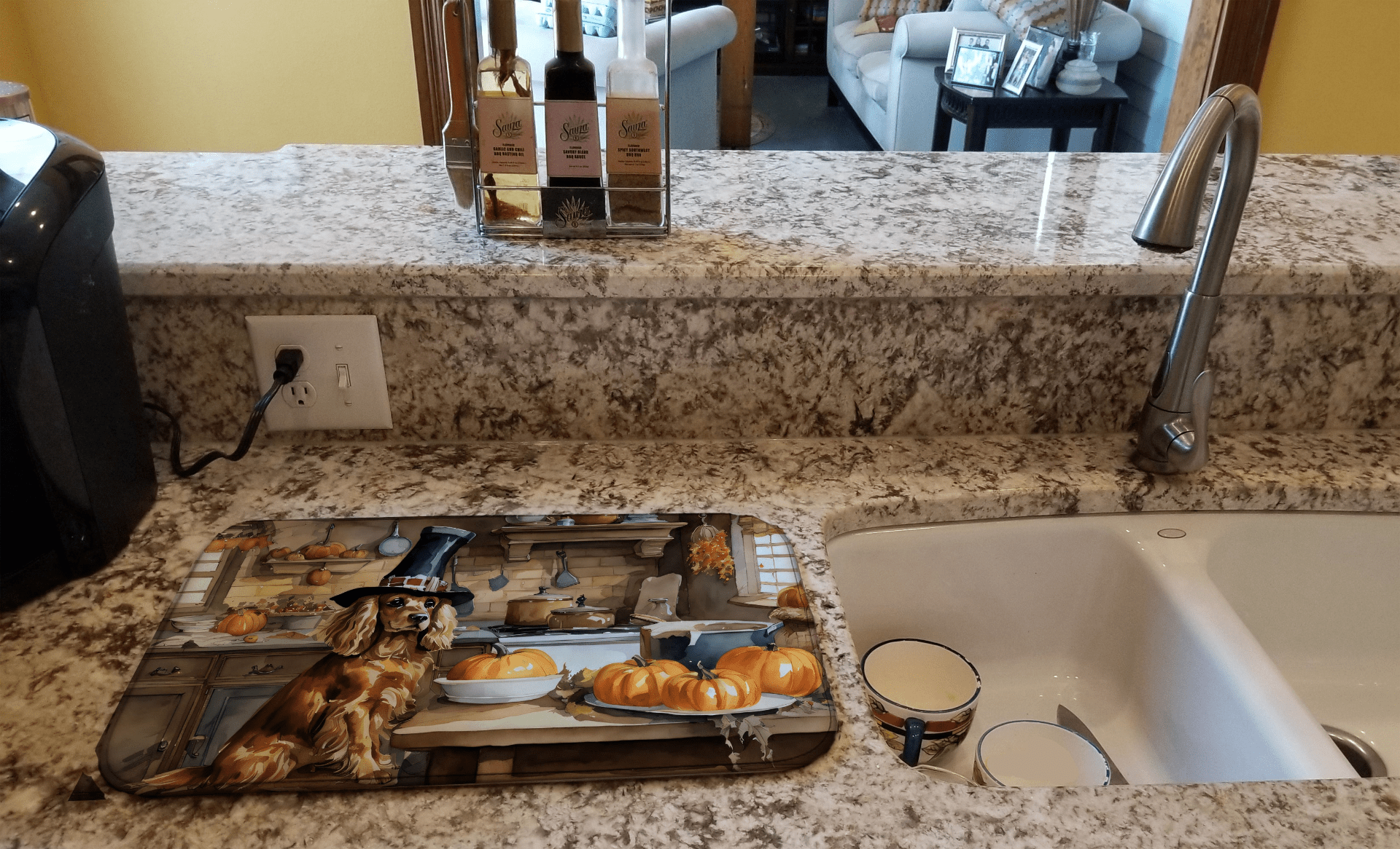 Celebrate Fall with a dish-drying mat that blends charming Cocker Spaniel artwork with everyday practicality. This mat keeps countertops dry as you air-dry dishes, glasses, and even fruits, while the absorbent surface adds a cozy seasonal touch to your kitchen. Designed for pet lovers who want style plus comfort in daily routines, it brings warmth, durability, and a refined finish to your space.