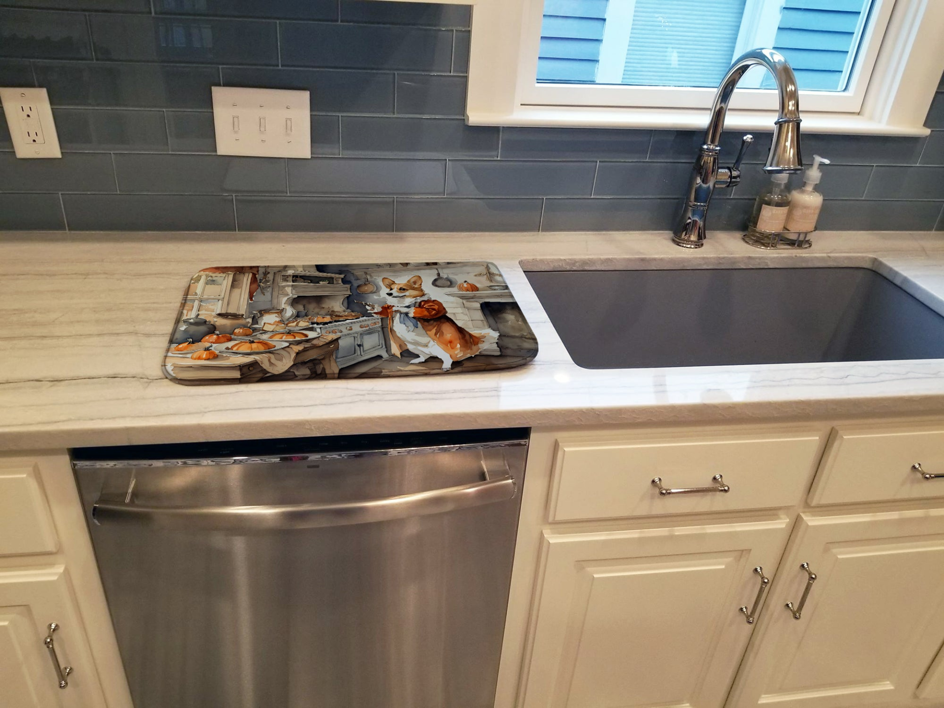 Dish Drying Mat featuring breed specific Corgi artwork. Celebrate Halloween with this Halloween Dish Drying Mat. Say goodbye to messy countertops and soggy dish towels with our innovative dish drying mat. Our high-quality dish drying pad is designed to keep your countertops dry while offering a stylish and efficient solution. Whether you're air drying dishes, glasses, stemware, silverware, pots, pans, bottles, or even fruits and vegetables, our dish mat is the perfect choice. The 14 inches x 22 inches size fits most counters and dish drying racks, and the non-slip design ensures stability. Made with water-absorbent polyester and a polyurethane foam insert, our dish drying mat is not only functional but also durable. It's machine washable and printed in the USA for long-lasting use. The beautiful artwork adds flair to your kitchen decor, making it a perfect housewarming gift or present for any occasion. Upgrade your kitchen experience with our absorbent and versatile dish drying mat.