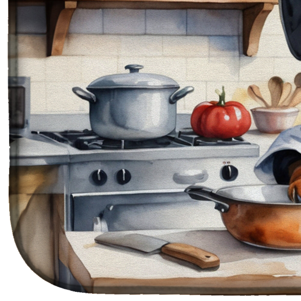 Dish Drying Mat featuring breed specific Dachshund artwork. Say goodbye to messy countertops and soggy dish towels with our innovative dish drying mat. Our high-quality dish drying pad is designed to keep your countertops dry while offering a stylish and efficient solution. Whether you're air drying dishes, glasses, stemware, silverware, pots, pans, bottles, or even fruits and vegetables, our dish mat is the perfect choice. The 14 inches x 22 inches size fits most counters and dish drying racks, and the non-slip design ensures stability. Made with water-absorbent polyester and a polyurethane foam insert, our dish drying mat is not only functional but also durable. It's machine washable and printed in the USA for long-lasting use. The beautiful artwork adds flair to your kitchen decor, making it a perfect housewarming gift or present for any occasion. Upgrade your kitchen experience with our absorbent and versatile dish drying mat.