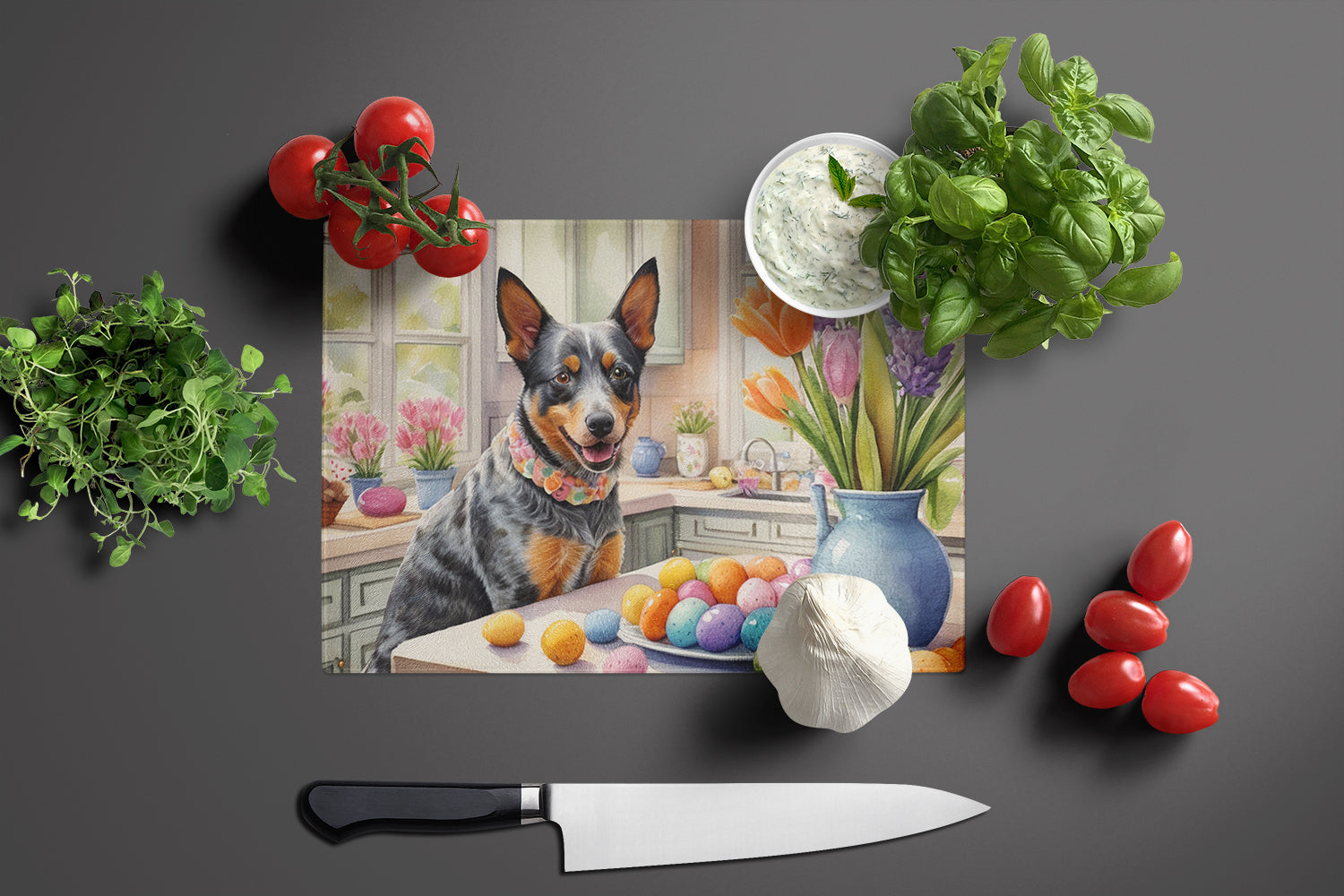 Decorating Easter Australian Cattle Dog Glass Cutting Board