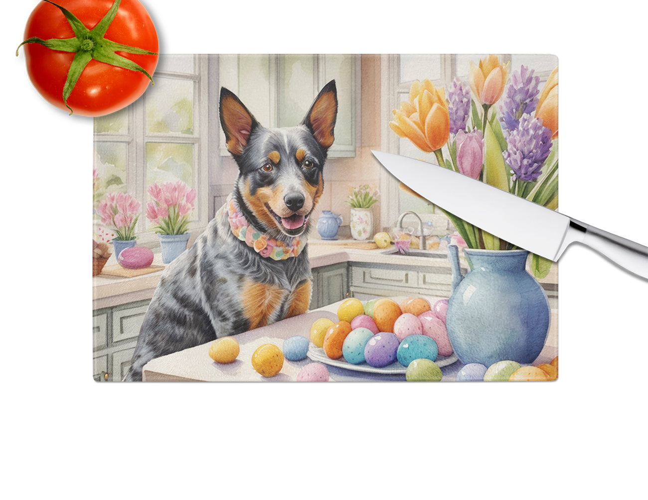 Glass Cutting Board featuring breed specific Australian Cattle Dog artwork. Celebrate Easter with this Easter Cutting Board. Introduce your kitchen to the vibrant, large Decorative Glass Cutting Board from Caroline's Treasures. Crafted from resilient tempered glass, this board is not only a utilitarian necessity but also a colorful art piece. With its generous dimensions of 15 inches in height and 12 inches in length, it offers ample space for all your cutting needs. Every piece showcases captivating artwork from distinguished artists, bringing an aesthetic edge to your kitchen. Beyond its attractive design, this cutting board ensures your countertop stays pristine and unscathed, owing to its heat-resistant properties. Engineered with user convenience in mind, it features non-skid feet for stability, and rounded corners for additional safety. Its robust construction renders it virtually unbreakable, guaranteeing longevity. The board comes with protective feet bumpers, maintaining its position during use. This product is recommended to be hand washed only. Proudly printed and assembled in the United States, this cutting board exemplifies superior craftsmanship. With Caroline's Treasures' Decorative Glass Cutting Board, you're investing in a blend of functionality and artistic flair.