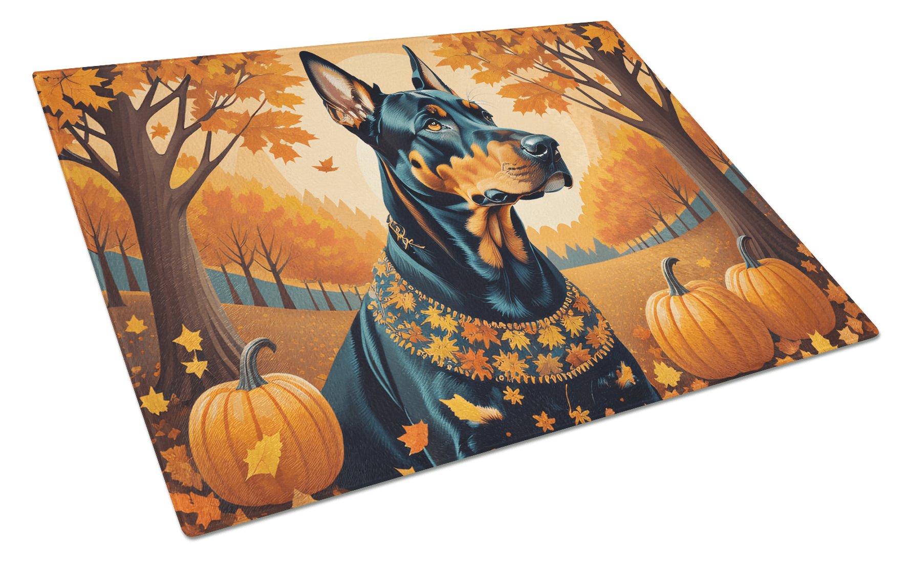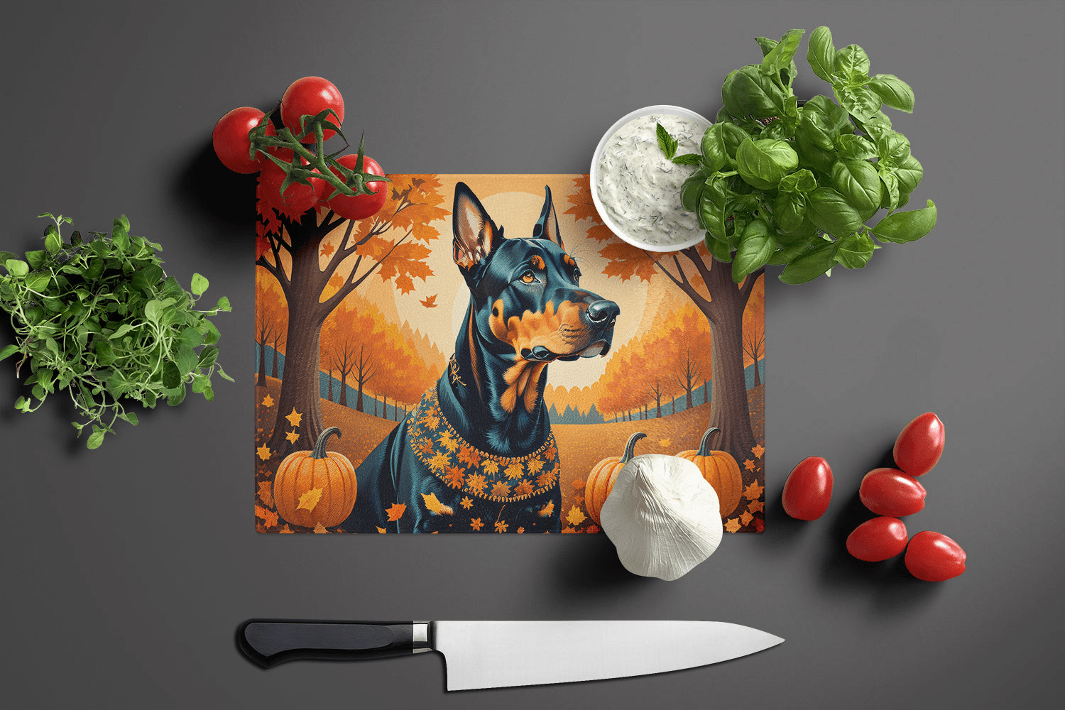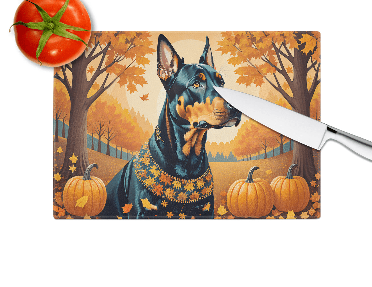 Glass Cutting Board featuring breed specific Doberman Pinscher artwork. Introduce your kitchen to the vibrant, large Decorative Glass Cutting Board from Caroline's Treasures. Crafted from resilient tempered glass, this board is not only a utilitarian necessity but also a colorful art piece. With its generous dimensions of 15 inches in height and 12 inches in length, it offers ample space for all your cutting needs. Every piece showcases captivating artwork from distinguished artists, bringing an aesthetic edge to your kitchen. Beyond its attractive design, this cutting board ensures your countertop stays pristine and unscathed, owing to its heat-resistant properties. Engineered with user convenience in mind, it features non-skid feet for stability, and rounded corners for additional safety. Its robust construction renders it virtually unbreakable, guaranteeing longevity. The board comes with protective feet bumpers, maintaining its position during use. This product is recommended to be hand washed only. Proudly printed and assembled in the United States, this cutting board exemplifies superior craftsmanship. With Caroline's Treasures' Decorative Glass Cutting Board, you're investing in a blend of functionality and artistic flair.
