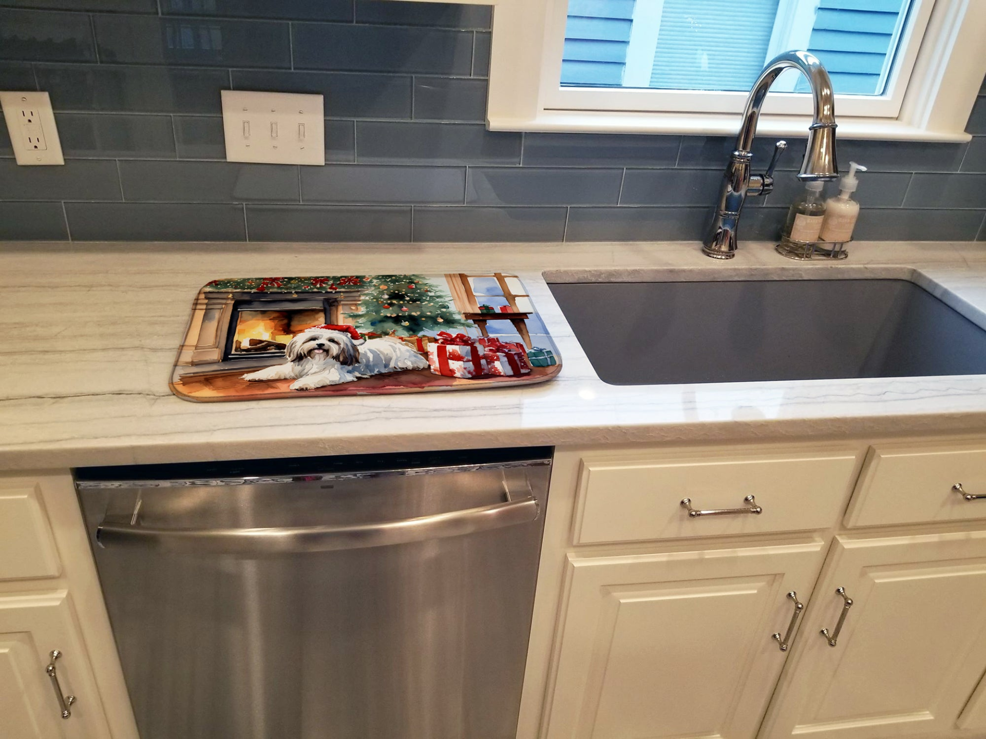 Dish Drying Mat featuring breed specific Havanese artwork. Celebrate Christmas with this Christmas Dish Drying Mat. Say goodbye to messy countertops and soggy dish towels with our innovative dish drying mat. Our high-quality dish drying pad is designed to keep your countertops dry while offering a stylish and efficient solution. Whether you're air drying dishes, glasses, stemware, silverware, pots, pans, bottles, or even fruits and vegetables, our dish mat is the perfect choice. The 14 inches x 22 inches size fits most counters and dish drying racks, and the non-slip design ensures stability. Made with water-absorbent polyester and a polyurethane foam insert, our dish drying mat is not only functional but also durable. It's machine washable and printed in the USA for long-lasting use. The beautiful artwork adds flair to your kitchen decor, making it a perfect housewarming gift or present for any occasion. Upgrade your kitchen experience with our absorbent and versatile dish drying mat.