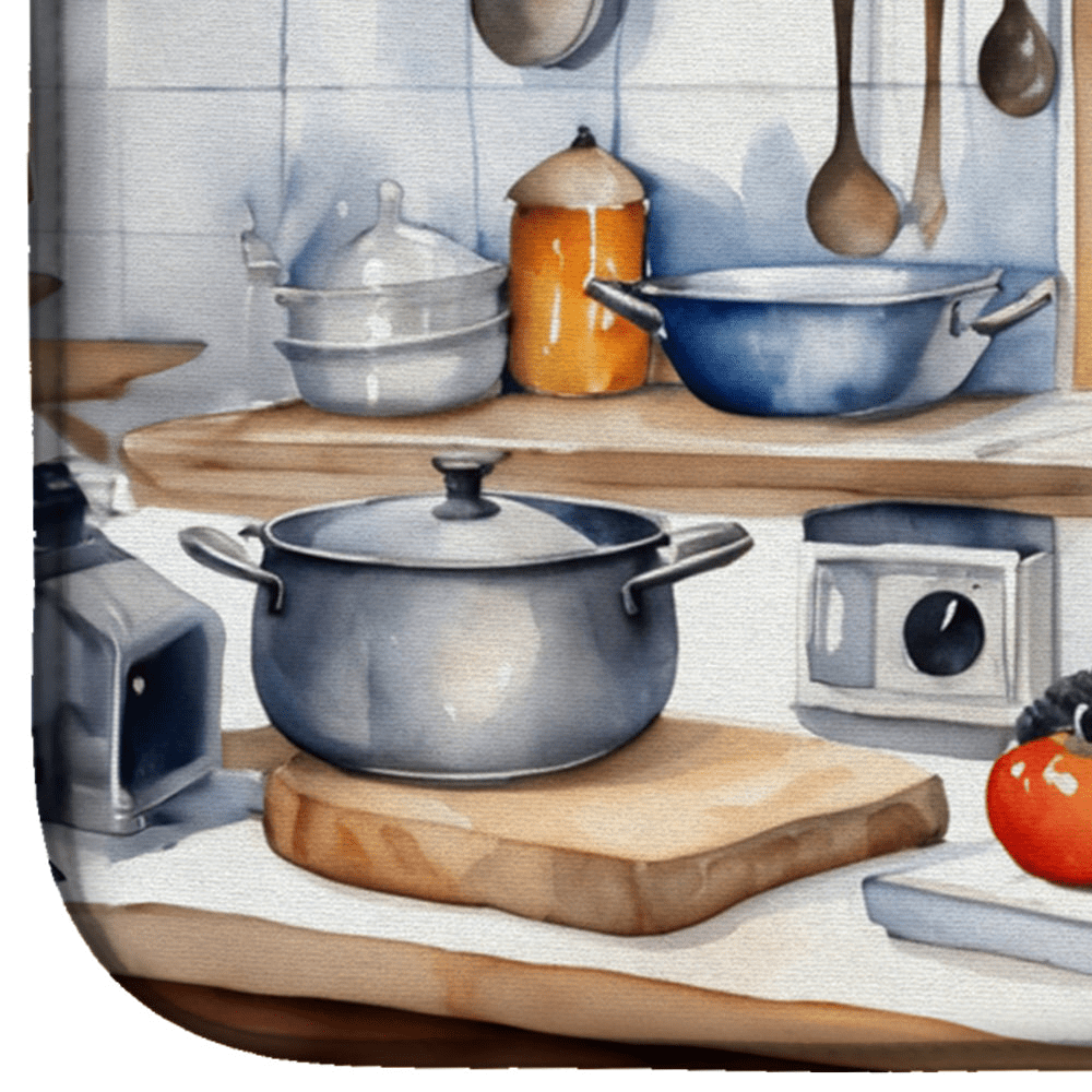 Elevate your daily kitchen routine with Kerry Blue Terrier The Chef Dish Drying Mat. This absorbent pad keeps countertops dry and clutter-free, while the charming Kerry Blue Terrier artwork adds a delightful, luxe touch to any kitchen. Perfect for air-drying dishes, glassware, pots, and even fruits, its generous 14 x 22 size and non-slip base bring practicality and whimsy to pet parents who want comfort and style.