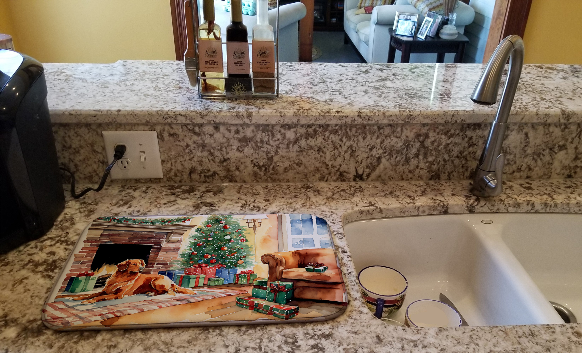Dish Drying Mat featuring breed specific Nova Scotia Duck Tolling Retriever artwork. Celebrate Christmas with this Christmas Dish Drying Mat. Say goodbye to messy countertops and soggy dish towels with our innovative dish drying mat. Our high-quality dish drying pad is designed to keep your countertops dry while offering a stylish and efficient solution. Whether you're air drying dishes, glasses, stemware, silverware, pots, pans, bottles, or even fruits and vegetables, our dish mat is the perfect choice. The 14 inches x 22 inches size fits most counters and dish drying racks, and the non-slip design ensures stability. Made with water-absorbent polyester and a polyurethane foam insert, our dish drying mat is not only functional but also durable. It's machine washable and printed in the USA for long-lasting use. The beautiful artwork adds flair to your kitchen decor, making it a perfect housewarming gift or present for any occasion. Upgrade your kitchen experience with our absorbent and versatile dish drying mat.