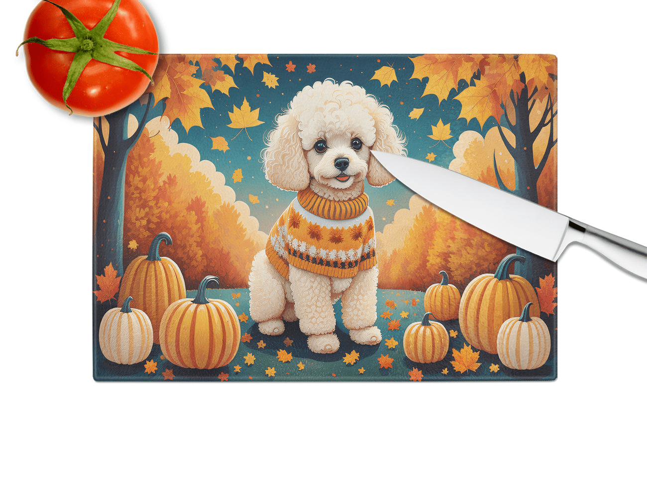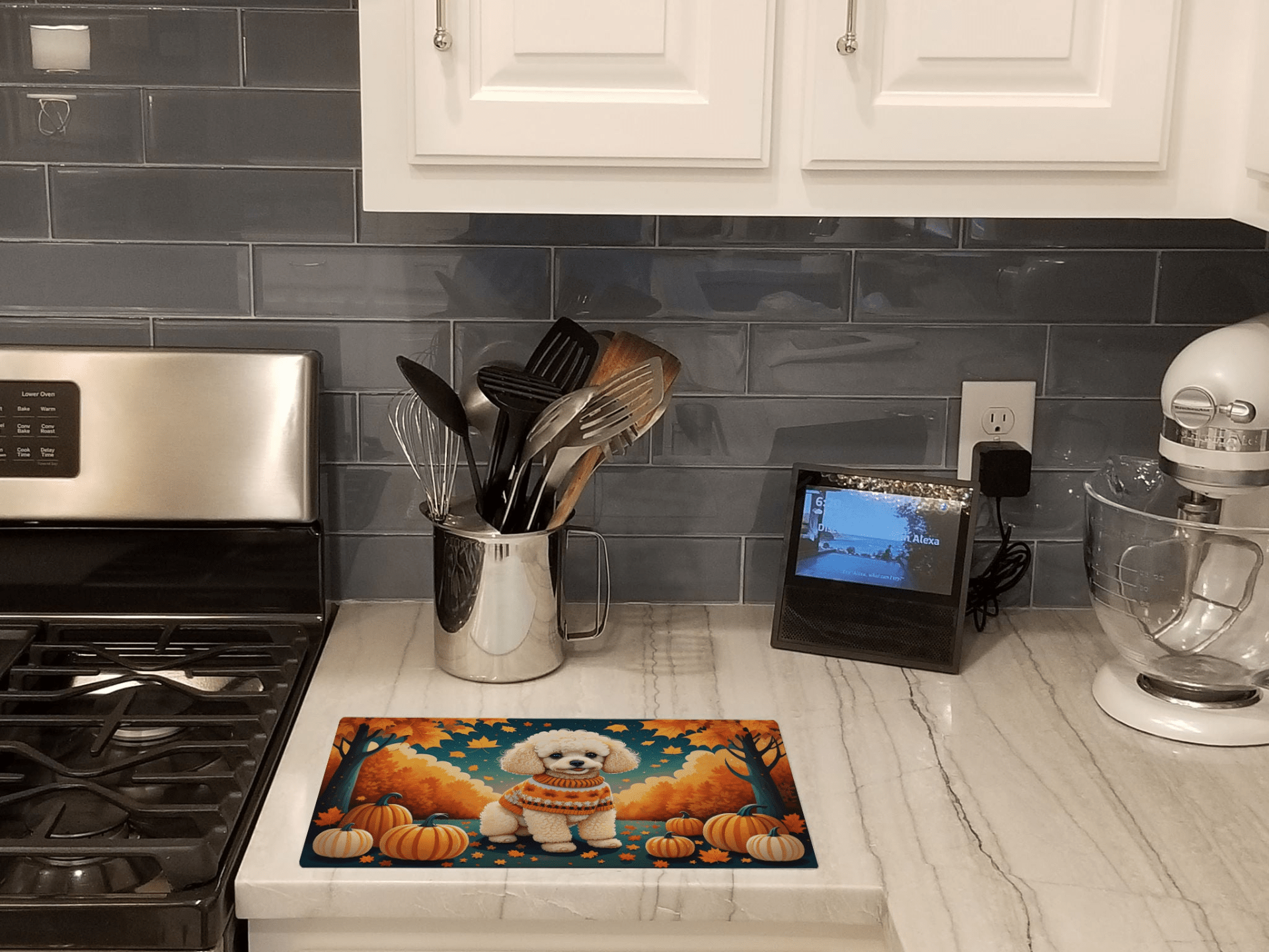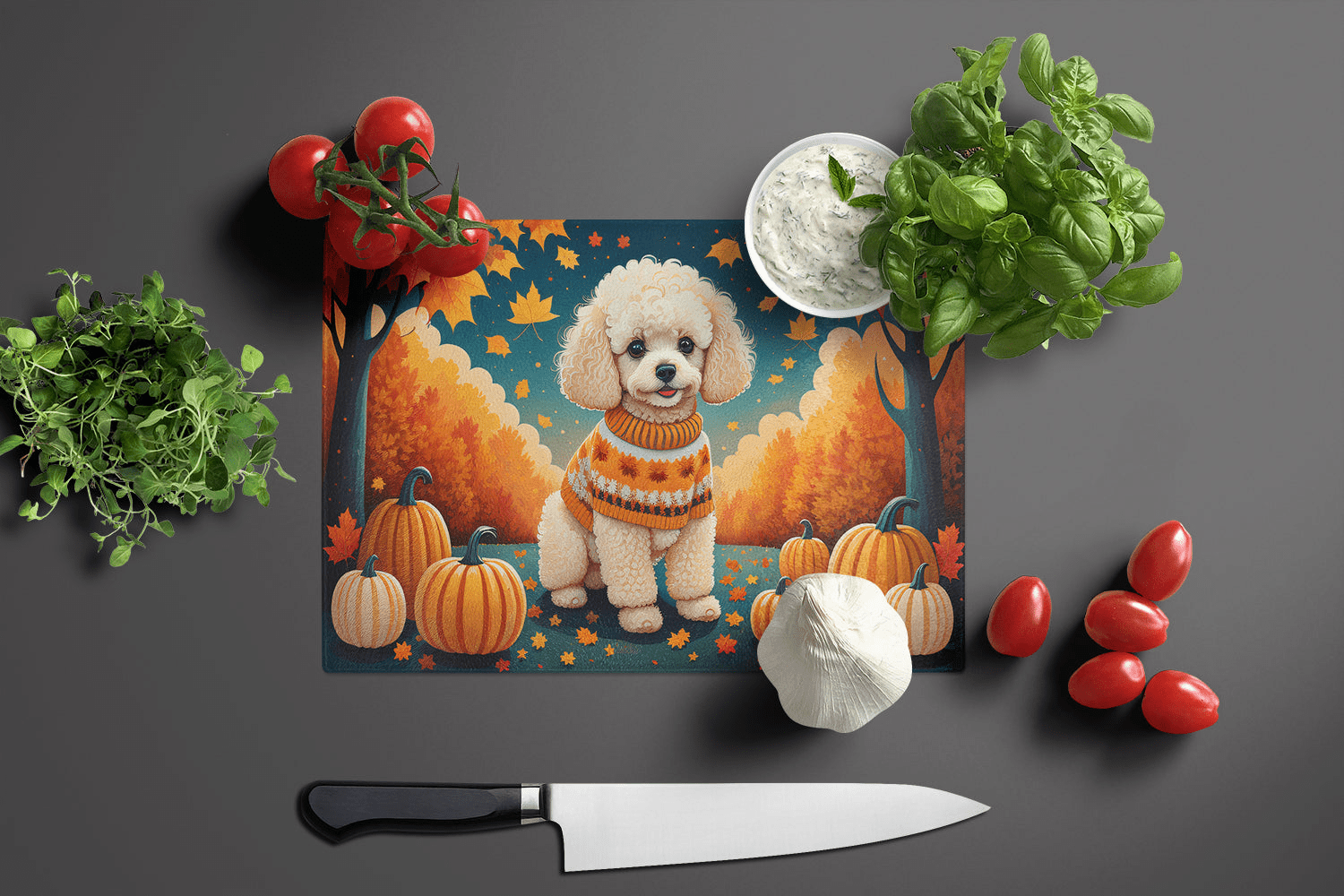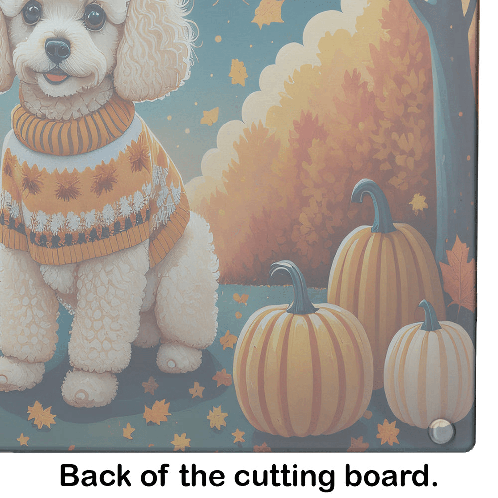 Glass Cutting Board featuring breed specific Poodle artwork. Introduce your kitchen to the vibrant, large Decorative Glass Cutting Board from Caroline's Treasures. Crafted from resilient tempered glass, this board is not only a utilitarian necessity but also a colorful art piece. With its generous dimensions of 15 inches in height and 12 inches in length, it offers ample space for all your cutting needs. Every piece showcases captivating artwork from distinguished artists, bringing an aesthetic edge to your kitchen. Beyond its attractive design, this cutting board ensures your countertop stays pristine and unscathed, owing to its heat-resistant properties. Engineered with user convenience in mind, it features non-skid feet for stability, and rounded corners for additional safety. Its robust construction renders it virtually unbreakable, guaranteeing longevity. The board comes with protective feet bumpers, maintaining its position during use. This product is recommended to be hand washed only. Proudly printed and assembled in the United States, this cutting board exemplifies superior craftsmanship. With Caroline's Treasures' Decorative Glass Cutting Board, you're investing in a blend of functionality and artistic flair.