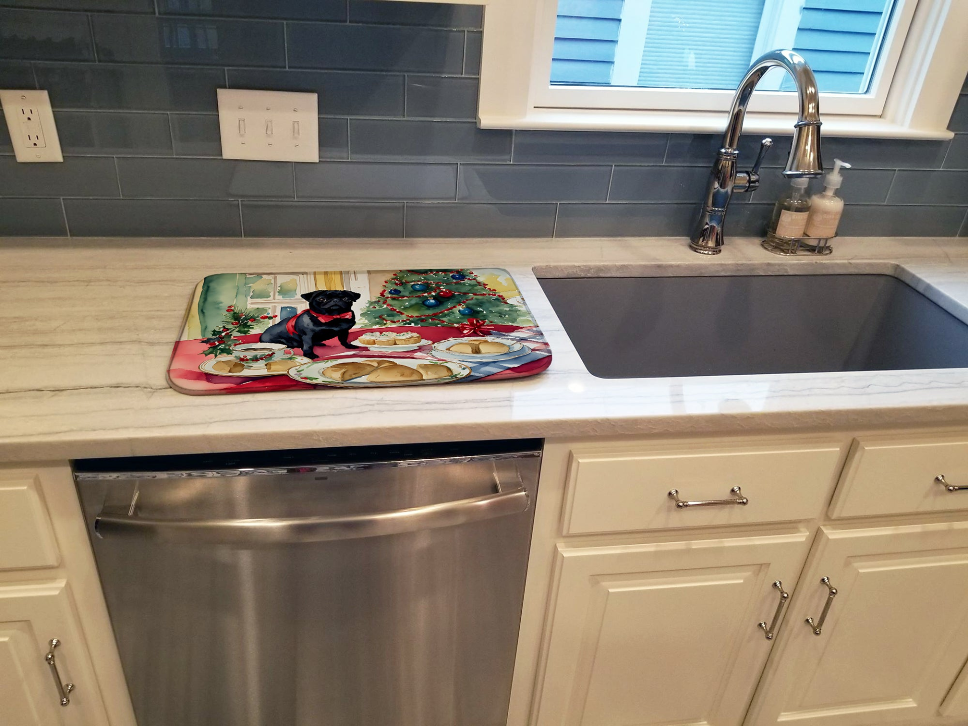 Dish Drying Mat featuring breed specific Pug artwork. Celebrate Christmas with this Christmas Dish Drying Mat. Say goodbye to messy countertops and soggy dish towels with our innovative dish drying mat. Our high-quality dish drying pad is designed to keep your countertops dry while offering a stylish and efficient solution. Whether you're air drying dishes, glasses, stemware, silverware, pots, pans, bottles, or even fruits and vegetables, our dish mat is the perfect choice. The 14 inches x 22 inches size fits most counters and dish drying racks, and the non-slip design ensures stability. Made with water-absorbent polyester and a polyurethane foam insert, our dish drying mat is not only functional but also durable. It's machine washable and printed in the USA for long-lasting use. The beautiful artwork adds flair to your kitchen decor, making it a perfect housewarming gift or present for any occasion. Upgrade your kitchen experience with our absorbent and versatile dish drying mat.