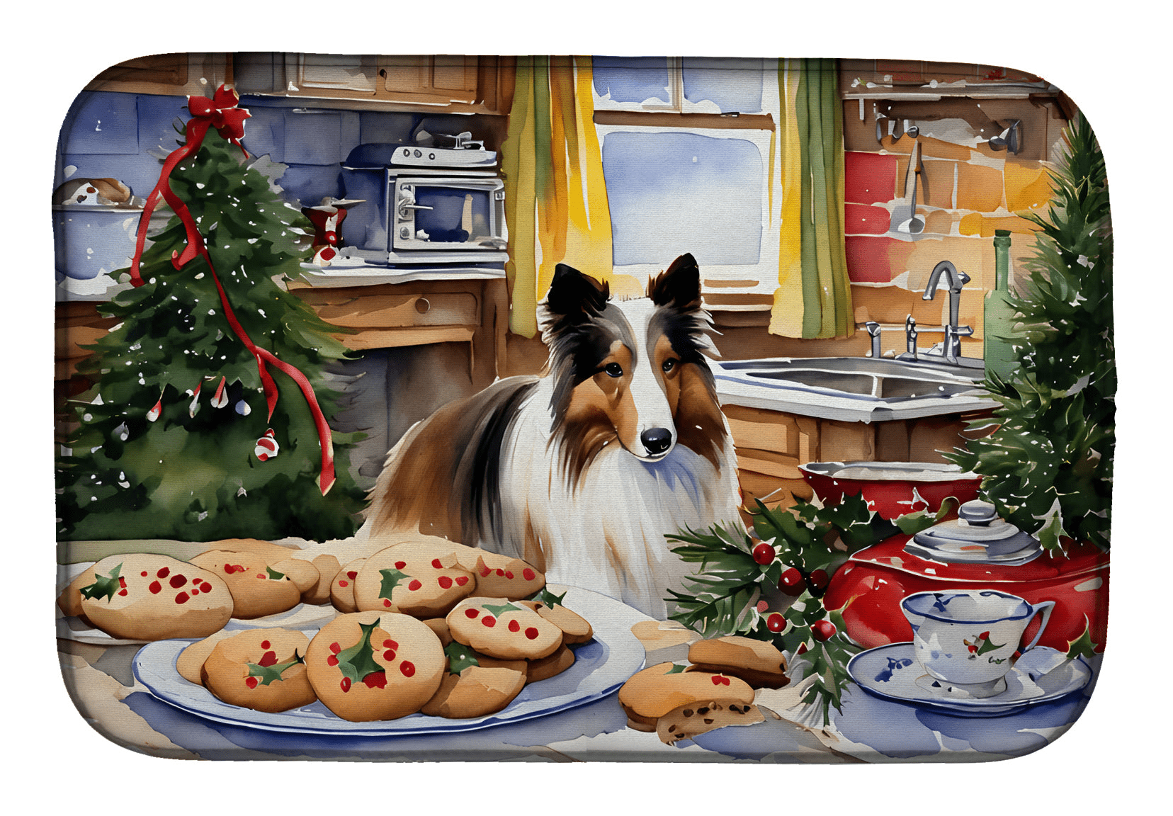 Sheltie Christmas Cookies Dish Drying Mat – Breed-Specific Shetland Sheepdog Kitchen Mat for Countertop Drying