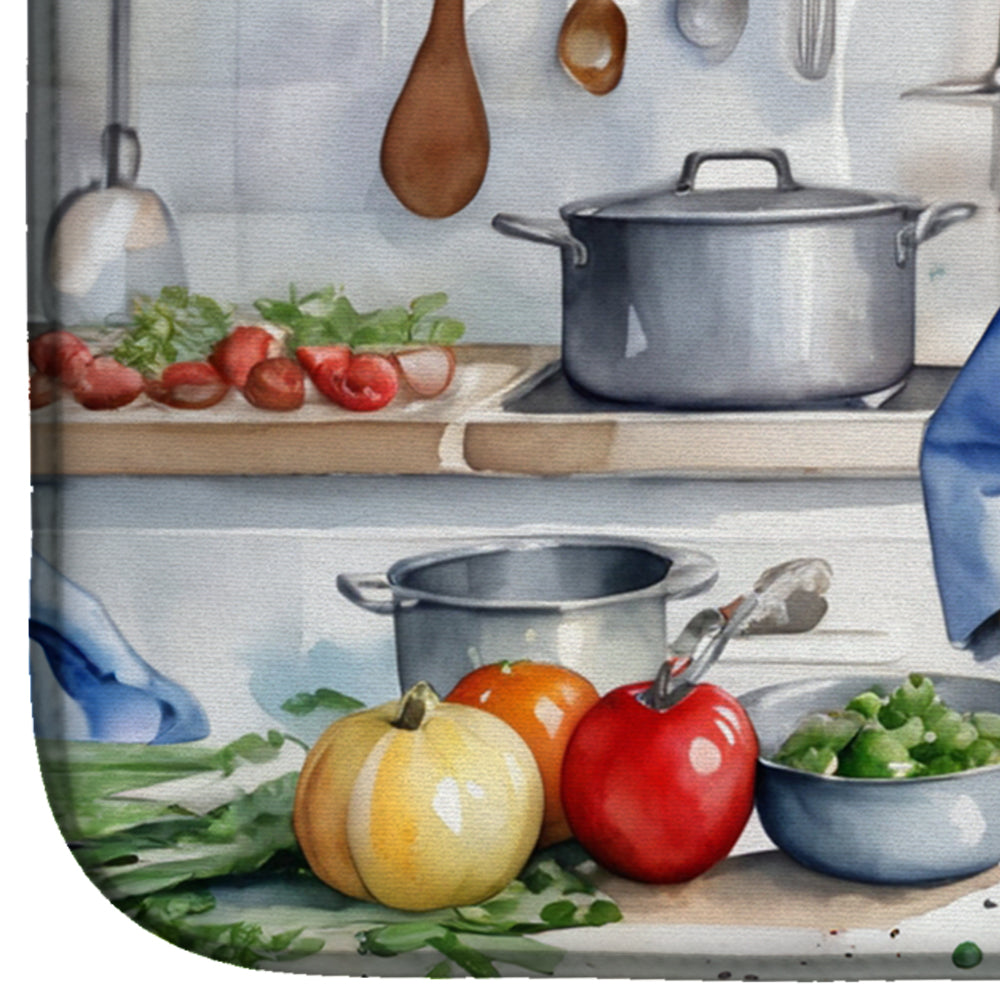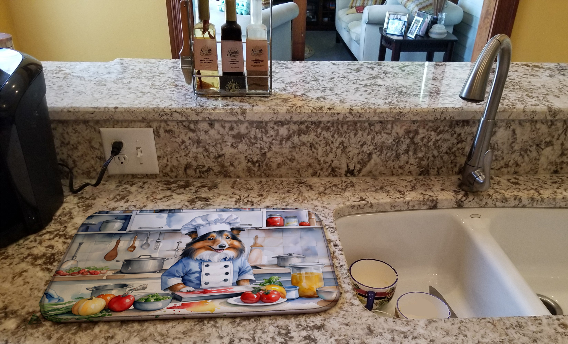 Dish Drying Mat featuring breed specific Sheltie Shetland Sheepdog artwork. Say goodbye to messy countertops and soggy dish towels with our innovative dish drying mat. Our high-quality dish drying pad is designed to keep your countertops dry while offering a stylish and efficient solution. Whether you're air drying dishes, glasses, stemware, silverware, pots, pans, bottles, or even fruits and vegetables, our dish mat is the perfect choice. The 14 inches x 22 inches size fits most counters and dish drying racks, and the non-slip design ensures stability. Made with water-absorbent polyester and a polyurethane foam insert, our dish drying mat is not only functional but also durable. It's machine washable and printed in the USA for long-lasting use. The beautiful artwork adds flair to your kitchen decor, making it a perfect housewarming gift or present for any occasion. Upgrade your kitchen experience with our absorbent and versatile dish drying mat.