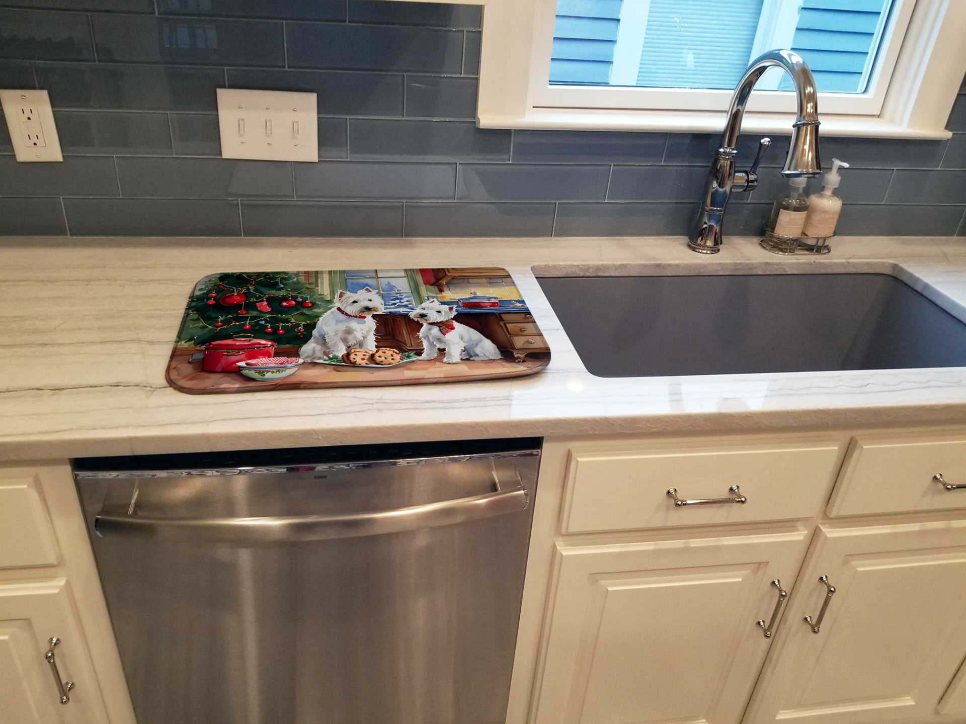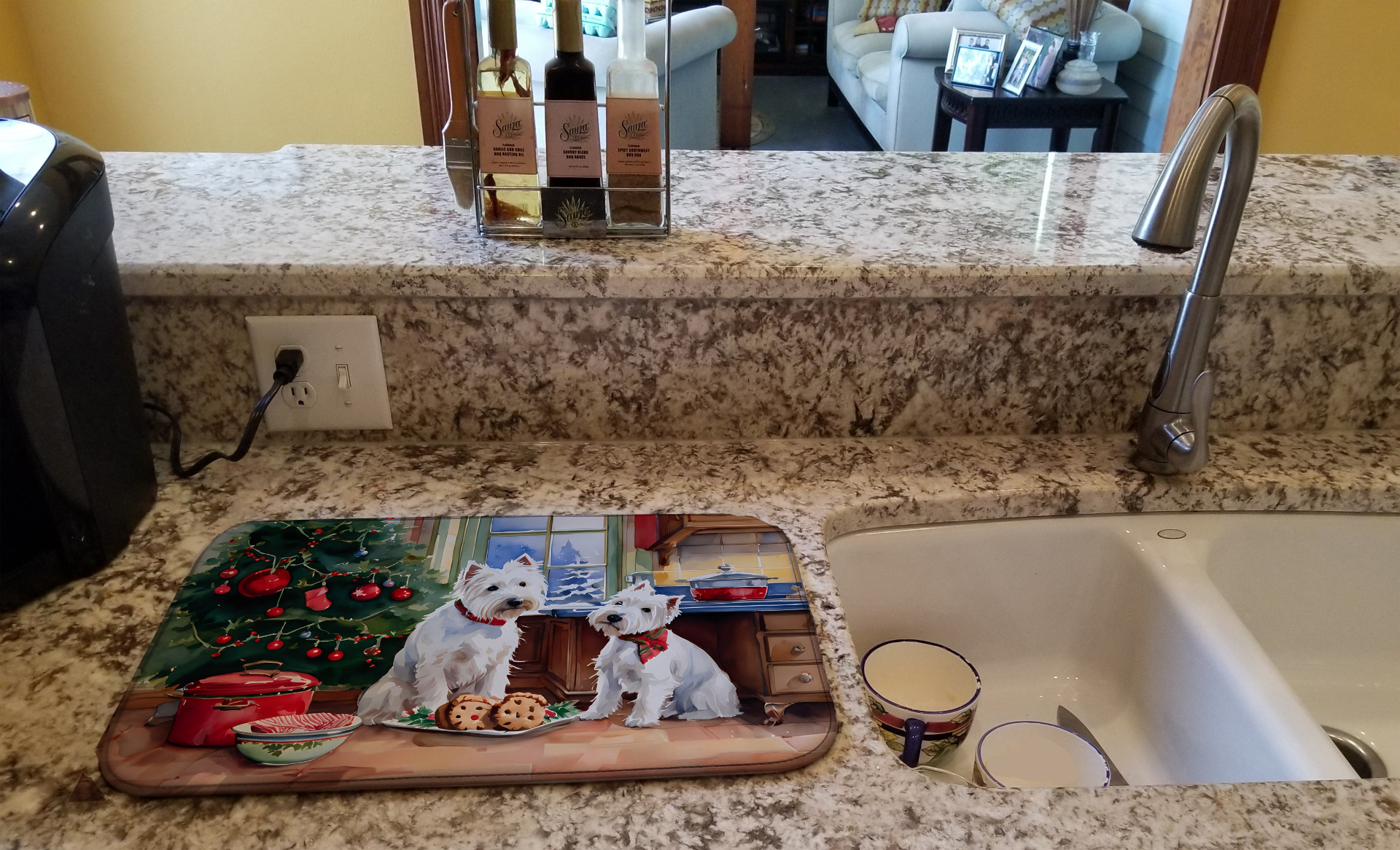 Dish Drying Mat featuring breed specific West Highland White Terrier artwork. Celebrate Christmas with this Christmas Dish Drying Mat. Say goodbye to messy countertops and soggy dish towels with our innovative dish drying mat. Our high-quality dish drying pad is designed to keep your countertops dry while offering a stylish and efficient solution. Whether you're air drying dishes, glasses, stemware, silverware, pots, pans, bottles, or even fruits and vegetables, our dish mat is the perfect choice. The 14 inches x 22 inches size fits most counters and dish drying racks, and the non-slip design ensures stability. Made with water-absorbent polyester and a polyurethane foam insert, our dish drying mat is not only functional but also durable. It's machine washable and printed in the USA for long-lasting use. The beautiful artwork adds flair to your kitchen decor, making it a perfect housewarming gift or present for any occasion. Upgrade your kitchen experience with our absorbent and versatile dish drying mat.