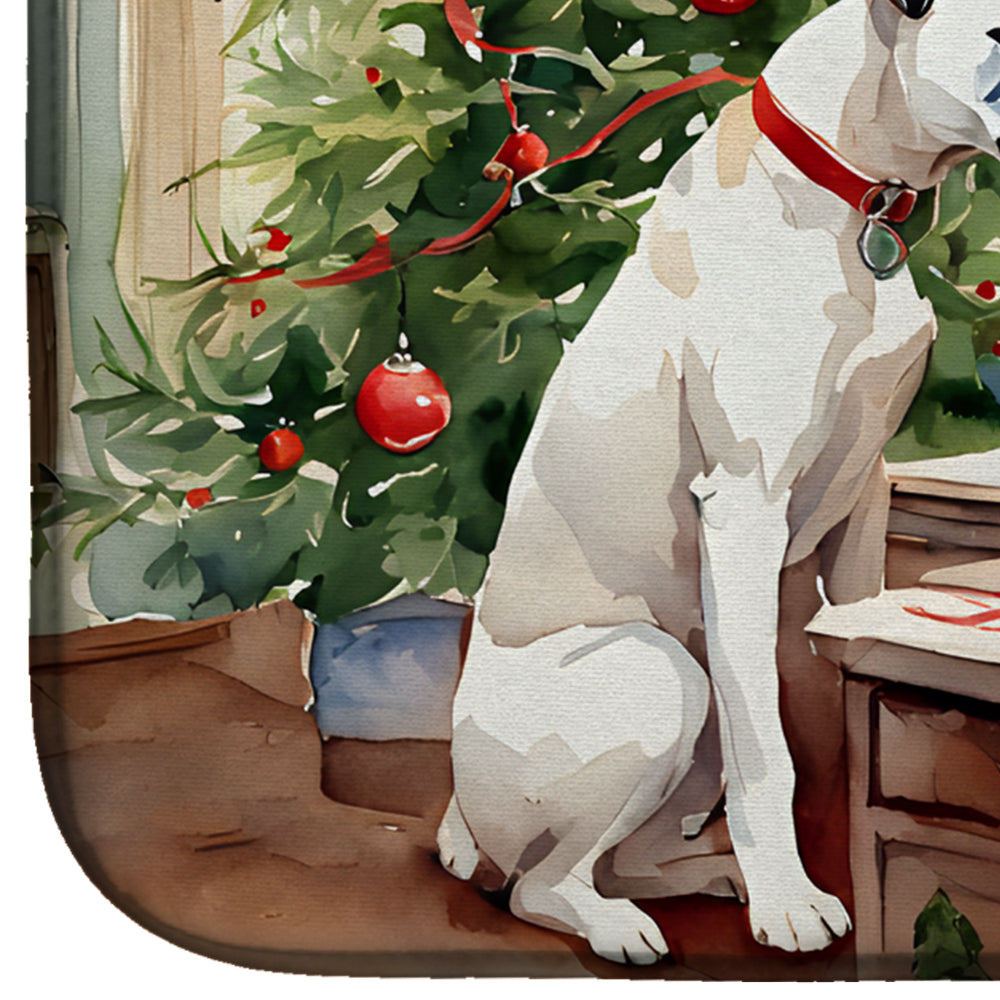 Dish Drying Mat featuring breed specific Boxer artwork. Celebrate Christmas with this Christmas Dish Drying Mat. Say goodbye to messy countertops and soggy dish towels with our innovative dish drying mat. Our high-quality dish drying pad is designed to keep your countertops dry while offering a stylish and efficient solution. Whether you're air drying dishes, glasses, stemware, silverware, pots, pans, bottles, or even fruits and vegetables, our dish mat is the perfect choice. The 14 inches x 22 inches size fits most counters and dish drying racks, and the non-slip design ensures stability. Made with water-absorbent polyester and a polyurethane foam insert, our dish drying mat is not only functional but also durable. It's machine washable and printed in the USA for long-lasting use. The beautiful artwork adds flair to your kitchen decor, making it a perfect housewarming gift or present for any occasion. Upgrade your kitchen experience with our absorbent and versatile dish drying mat.
