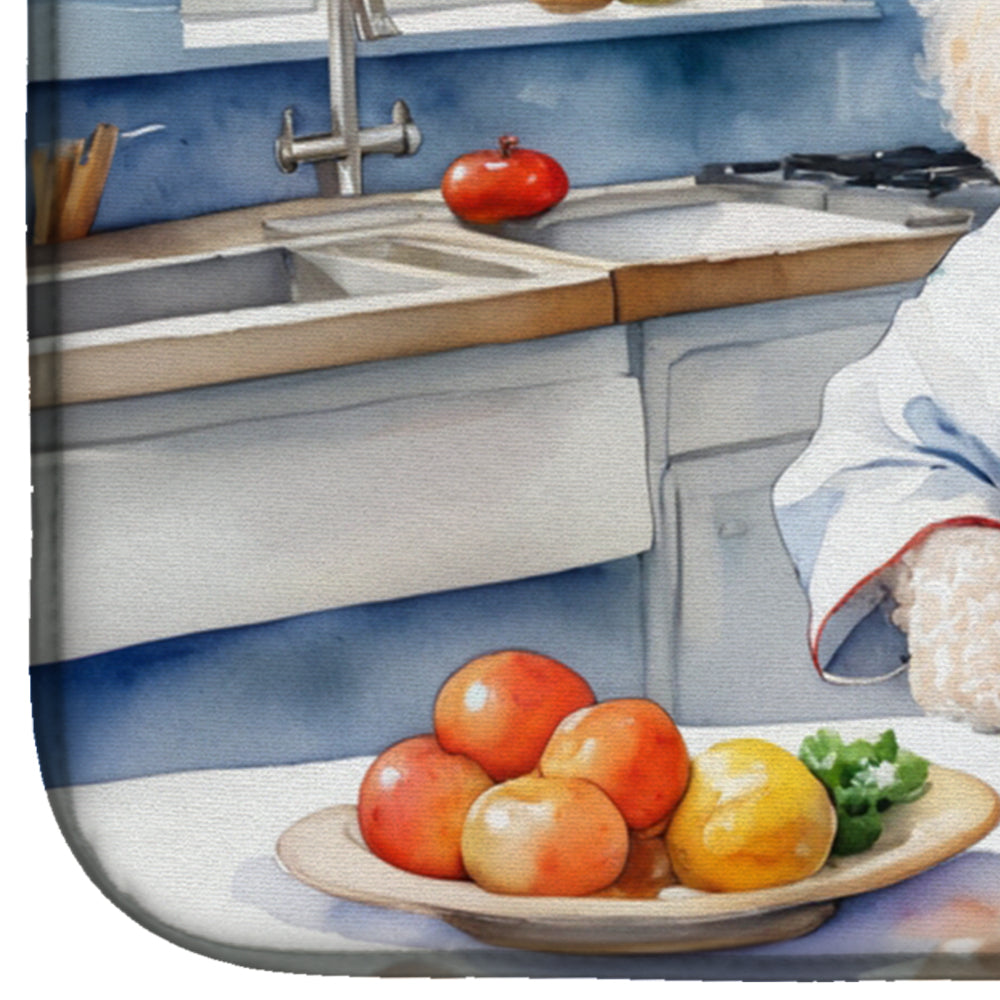 Dish Drying Mat featuring breed specific Poodle artwork. Say goodbye to messy countertops and soggy dish towels with our innovative dish drying mat. Our high-quality dish drying pad is designed to keep your countertops dry while offering a stylish and efficient solution. Whether you're air drying dishes, glasses, stemware, silverware, pots, pans, bottles, or even fruits and vegetables, our dish mat is the perfect choice. The 14 inches x 22 inches size fits most counters and dish drying racks, and the non-slip design ensures stability. Made with water-absorbent polyester and a polyurethane foam insert, our dish drying mat is not only functional but also durable. It's machine washable and printed in the USA for long-lasting use. The beautiful artwork adds flair to your kitchen decor, making it a perfect housewarming gift or present for any occasion. Upgrade your kitchen experience with our absorbent and versatile dish drying mat.