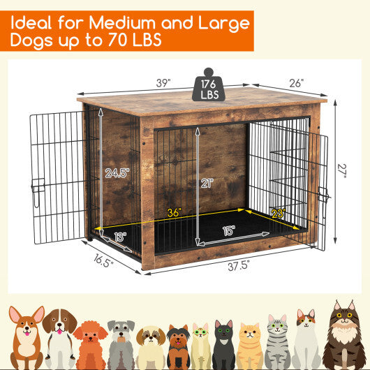 Specifications: 33 Inches Color Rustic Brown+Black Material Metal MDF Product Dimensions 33" x 22" x 25.5" Interior Size 31" x 20.5" x 22.5" Cushion Size 37.5" x 16.5" Front Door Size 15.5" x 18.5" Side Door Size 11.5" x 22.5" Interior Weight Capacity 45 lbs Table Weight Capacity 176 lbs Net Weight 47.5 lbs 37 Inches Color Rustic Brown+Black Material Metal MDF Product Dimensions 39" x 26" x 27" Interior Size 37.5" x 16.5" x 24.5" Cushion Size 36" x 23" Front Door Size 15" x 21" Side Door Size 13" x 24.5" Interior Weight Capacity 70 lbs Table Weight Capacity 176 lbs Net Weight 63 lbs Box QTY 1 Package Includes 1 x Dog Crate 1 x Cushion 1 x User's Manual
