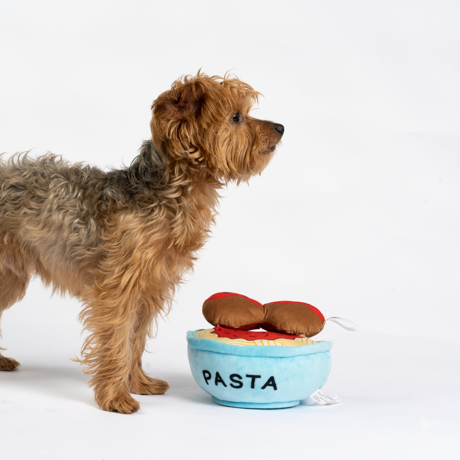 🍝 2-in-1 Design – Plush spaghetti bowl with removable squeaky meatballs.