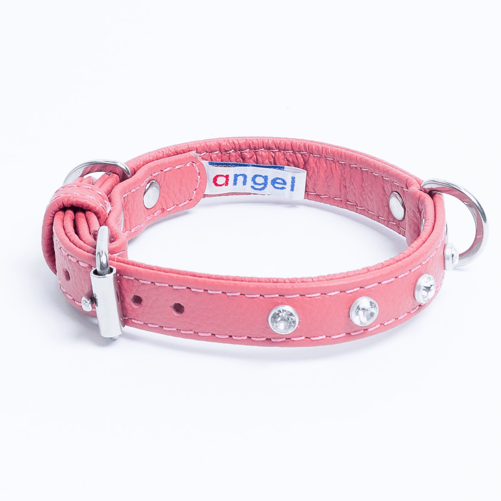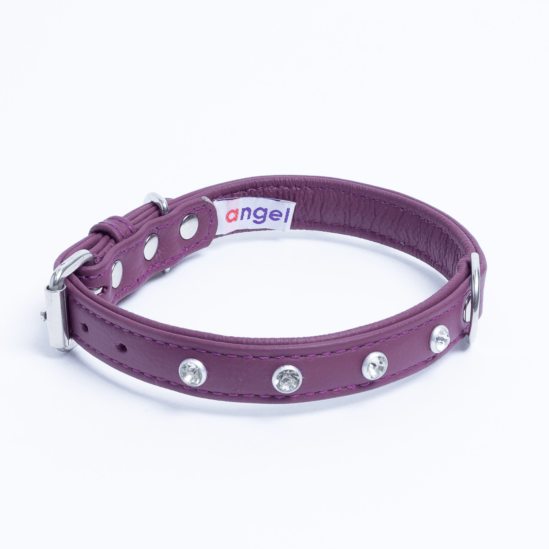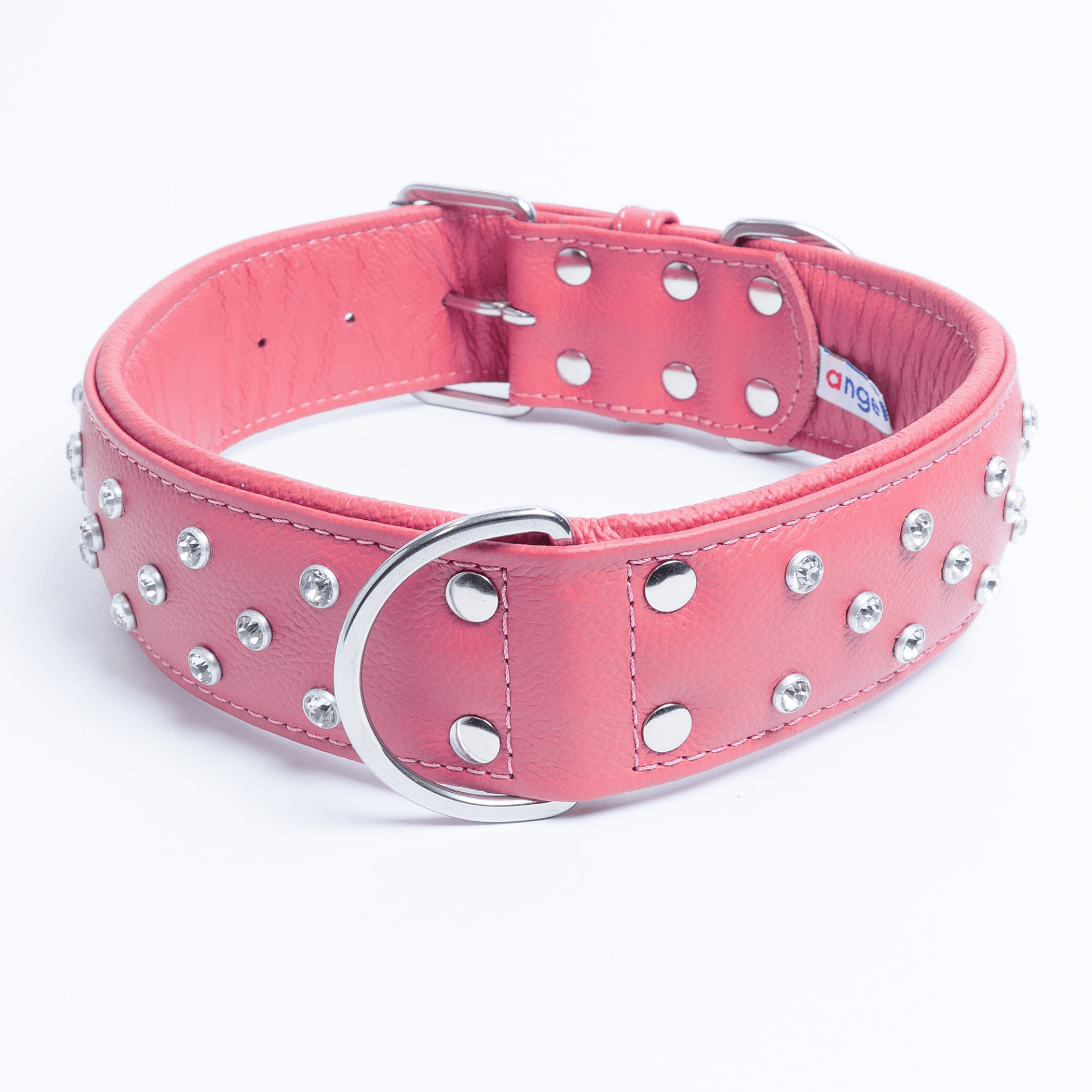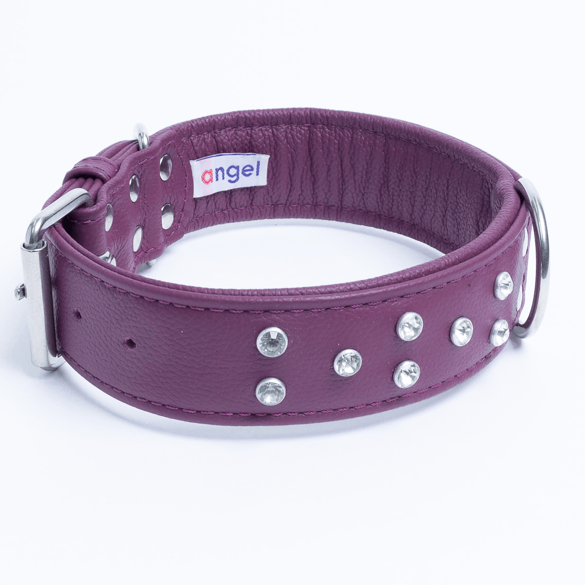 This top selling collection is sure to separate your dog from the rest of the pack. . Single or multi rows of shiny replica diamonds surround these blingy collars. This collection is made with genuine soft cowhide, padded for supreme comfort and stainless steel hardware. Available from 10" to 30", in increments of 2". The Angel signature centre D- ring is present for maximum control and exposure (except the 10" size).