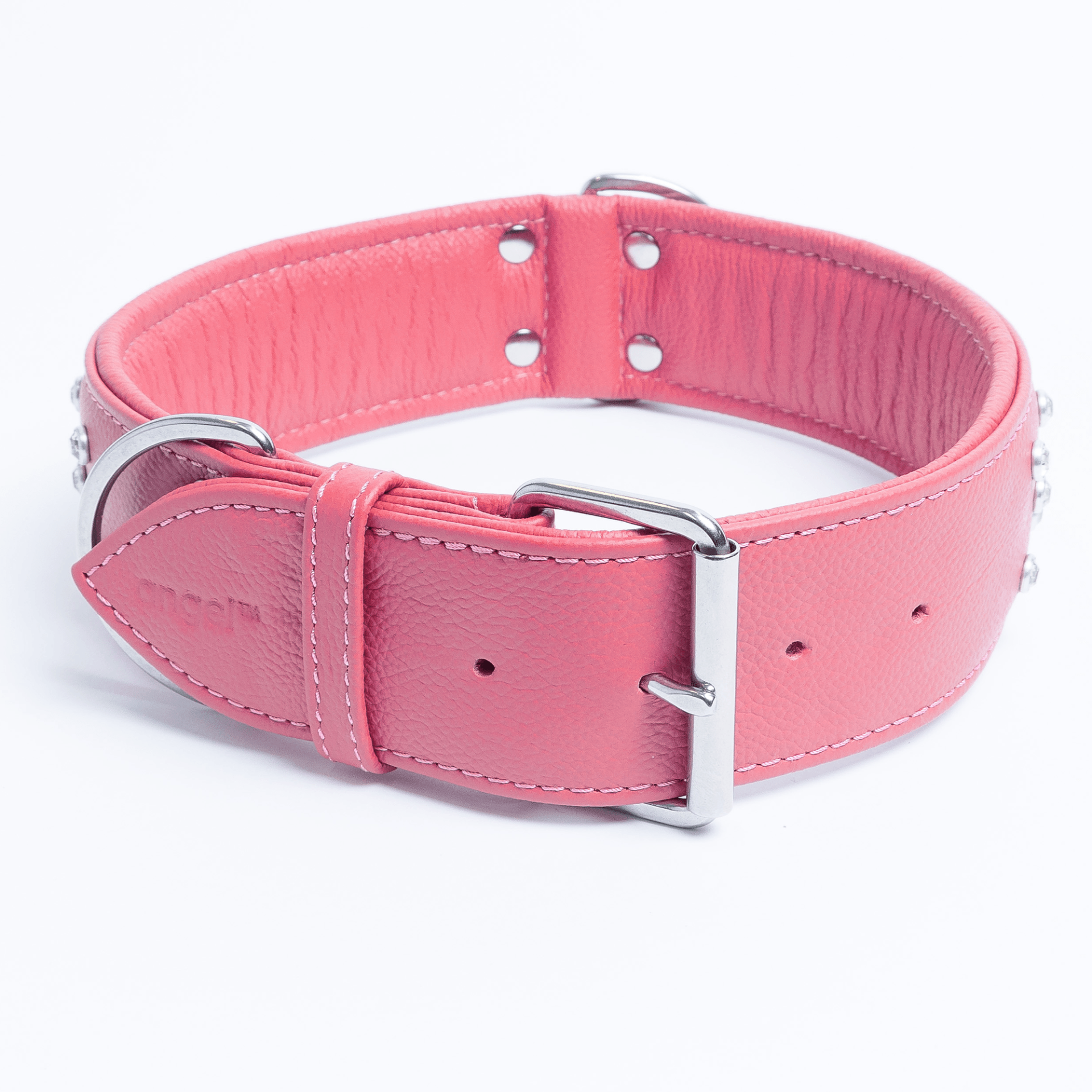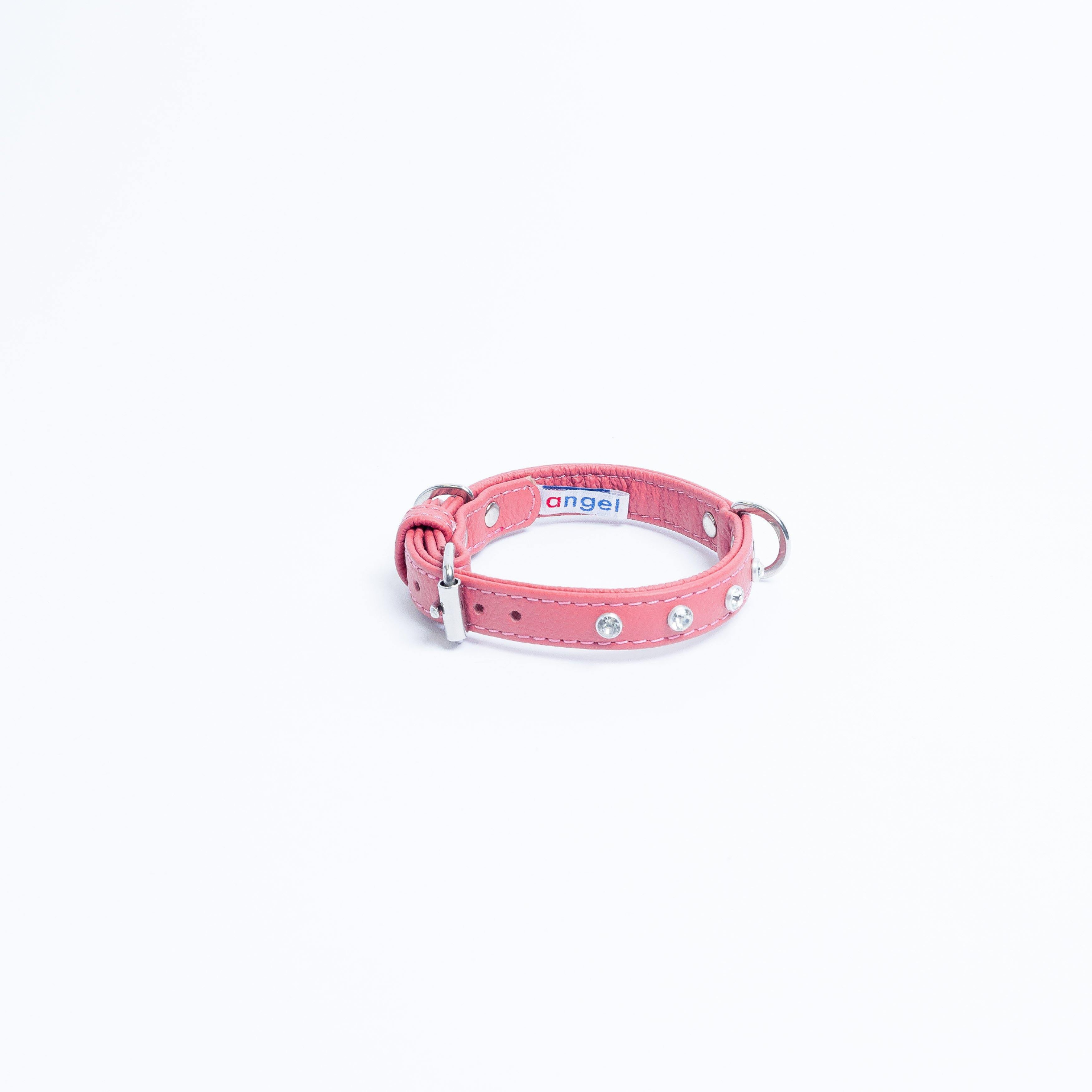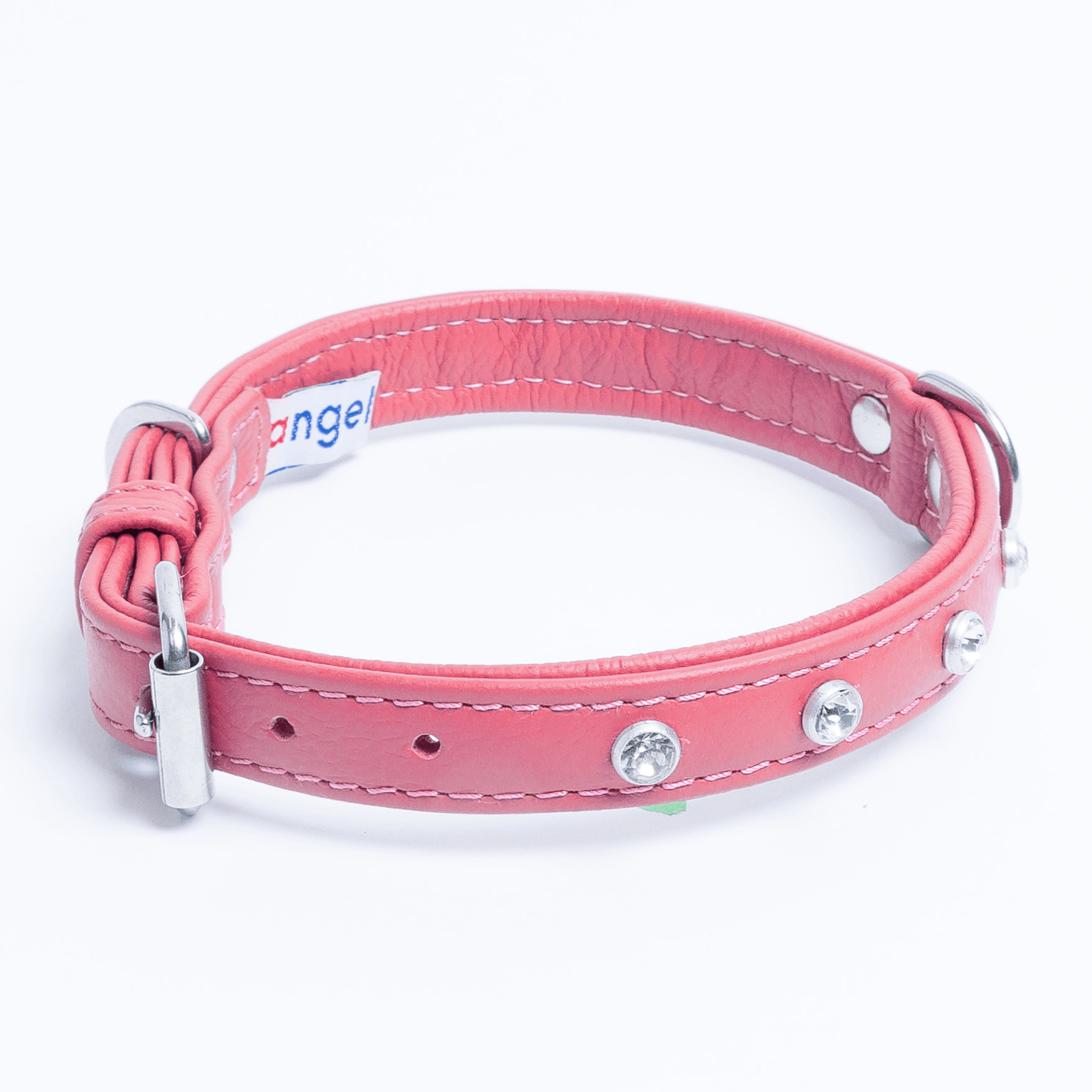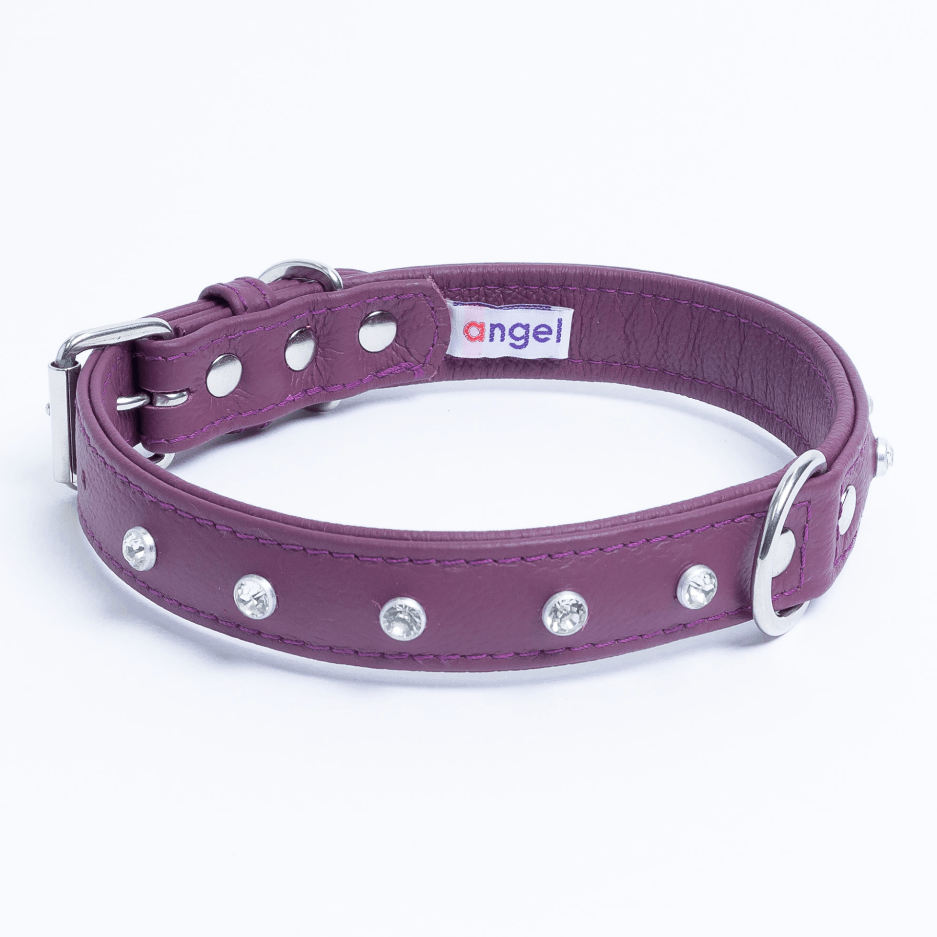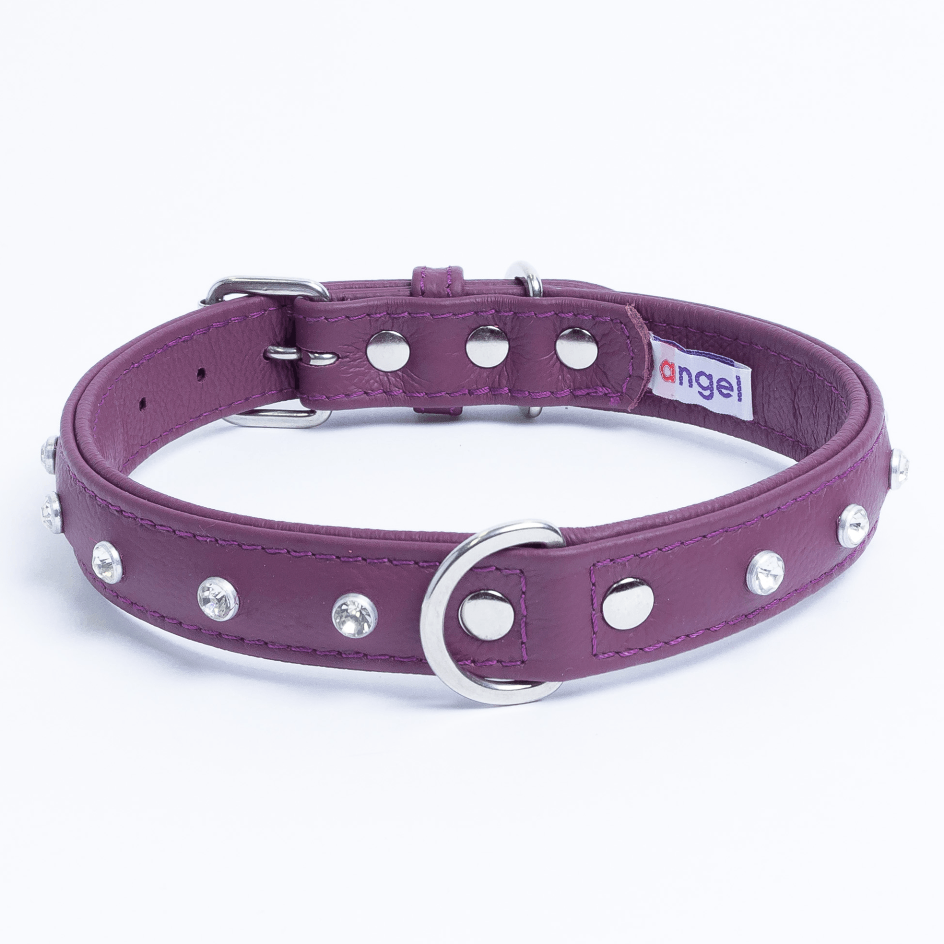 This top selling collection is sure to separate your dog from the rest of the pack. . Single or multi rows of shiny replica diamonds surround these blingy collars. This collection is made with genuine soft cowhide, padded for supreme comfort and stainless steel hardware. Available from 10" to 30", in increments of 2". The Angel signature centre D- ring is present for maximum control and exposure (except the 10" size).